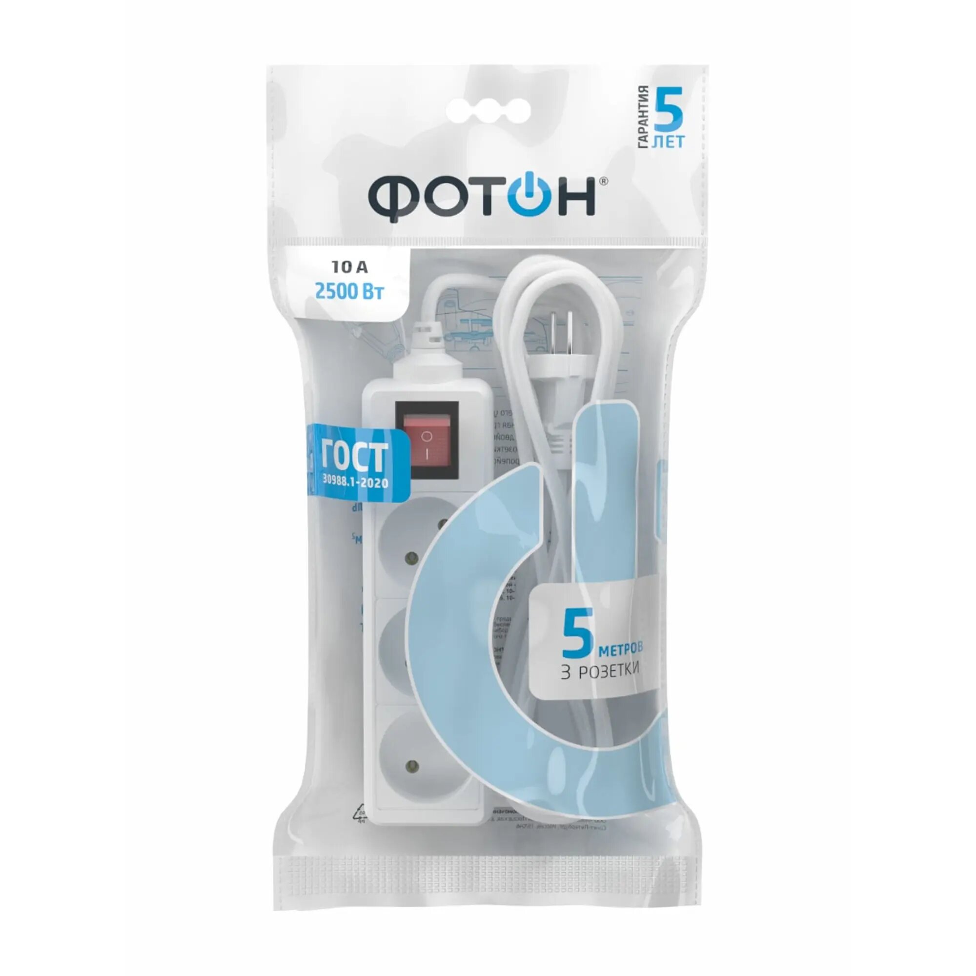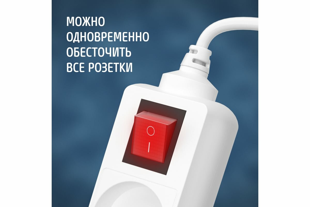 Удлинитель сетевой для розетки фотон 10А 2 метра 3 розетки с выключателем белый, ГОСТ