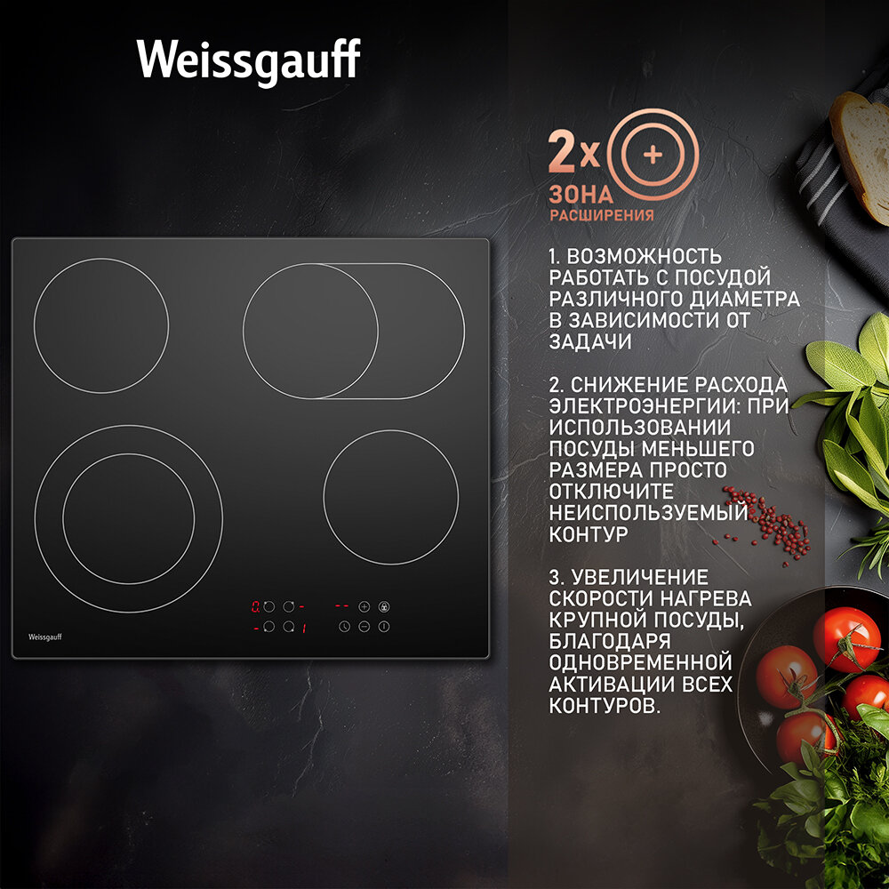 Электрическая варочная панель Weissgauff HV 642 BA, черный 3 года гарантии, таймер, блокировка от детей, защитное автоотключение, стеклокерамика