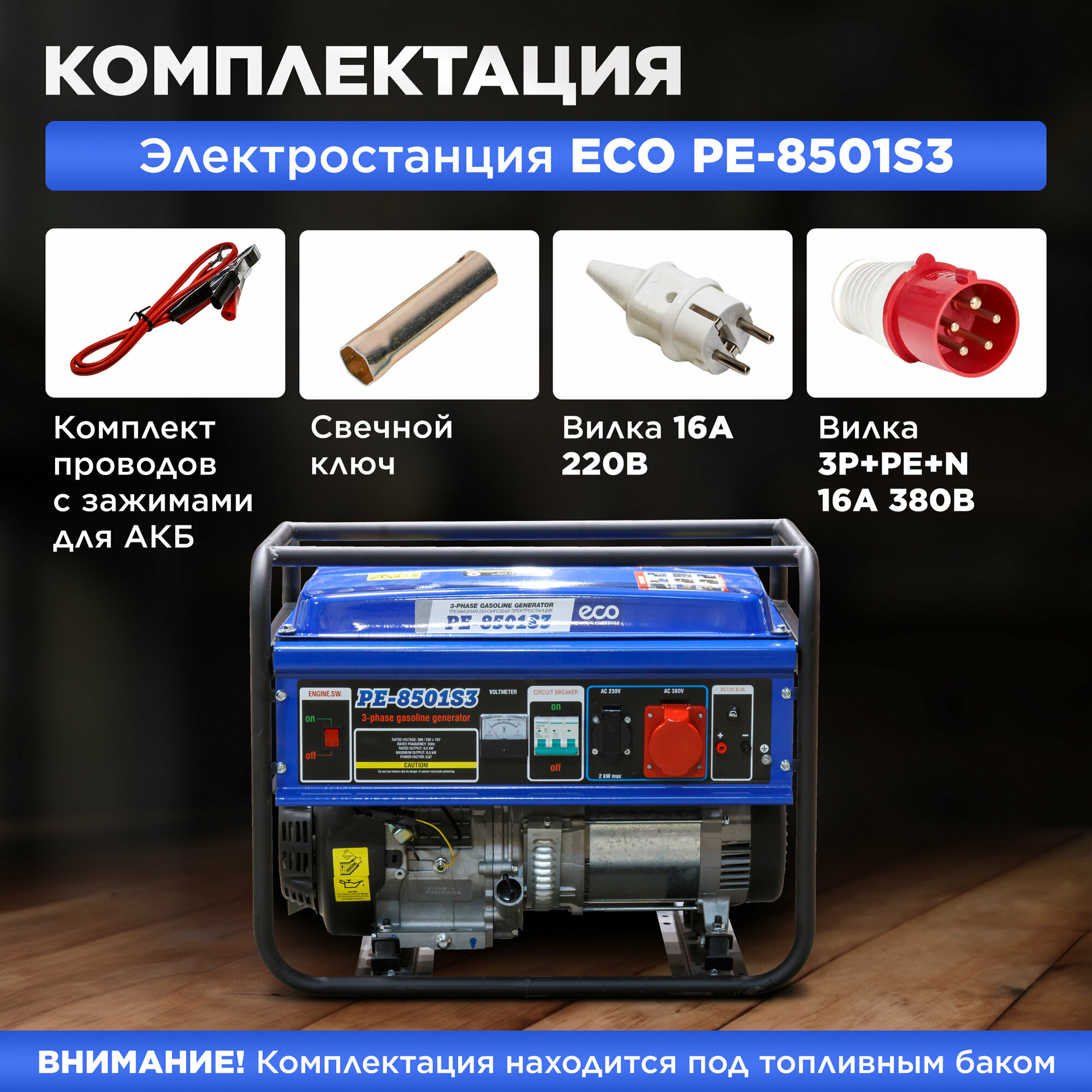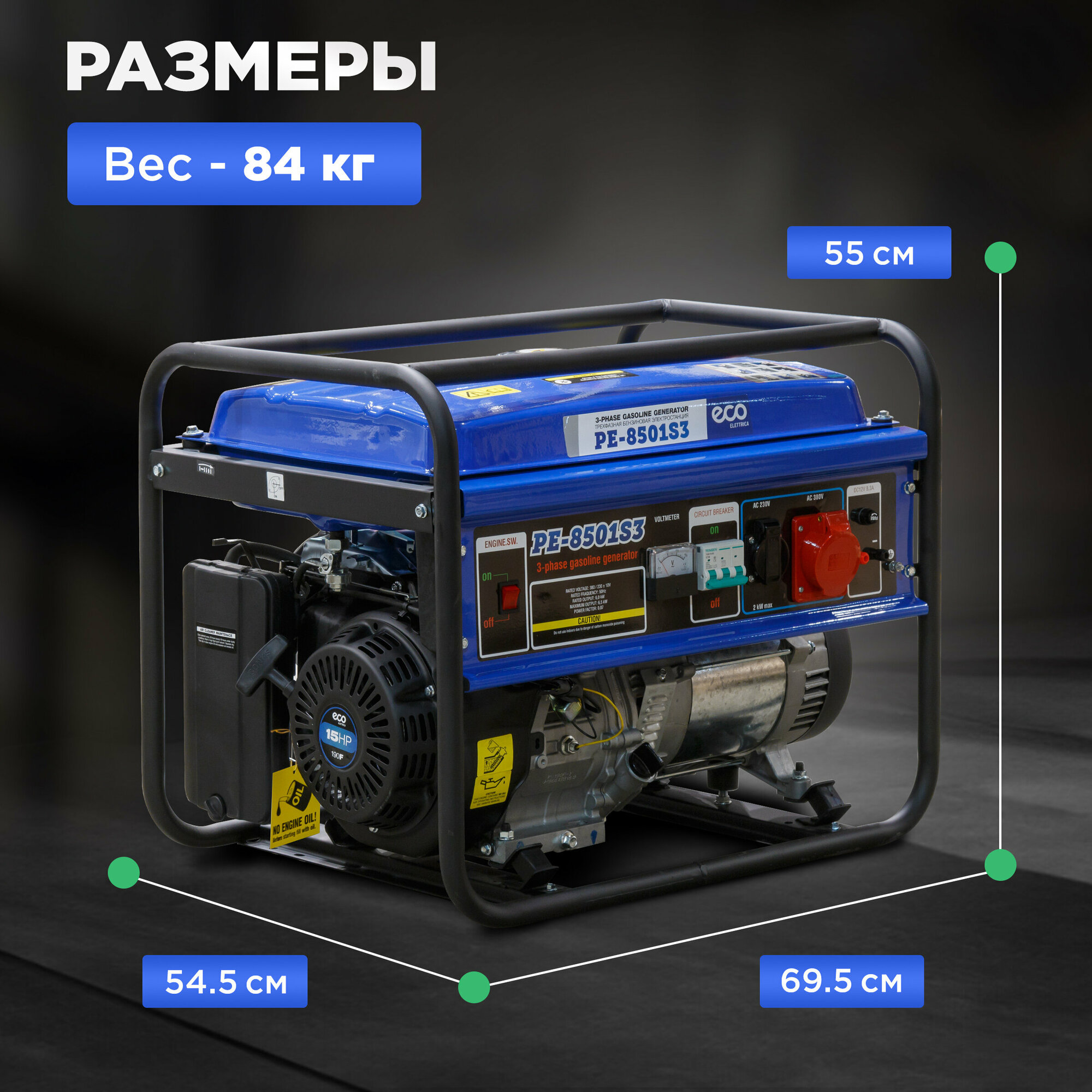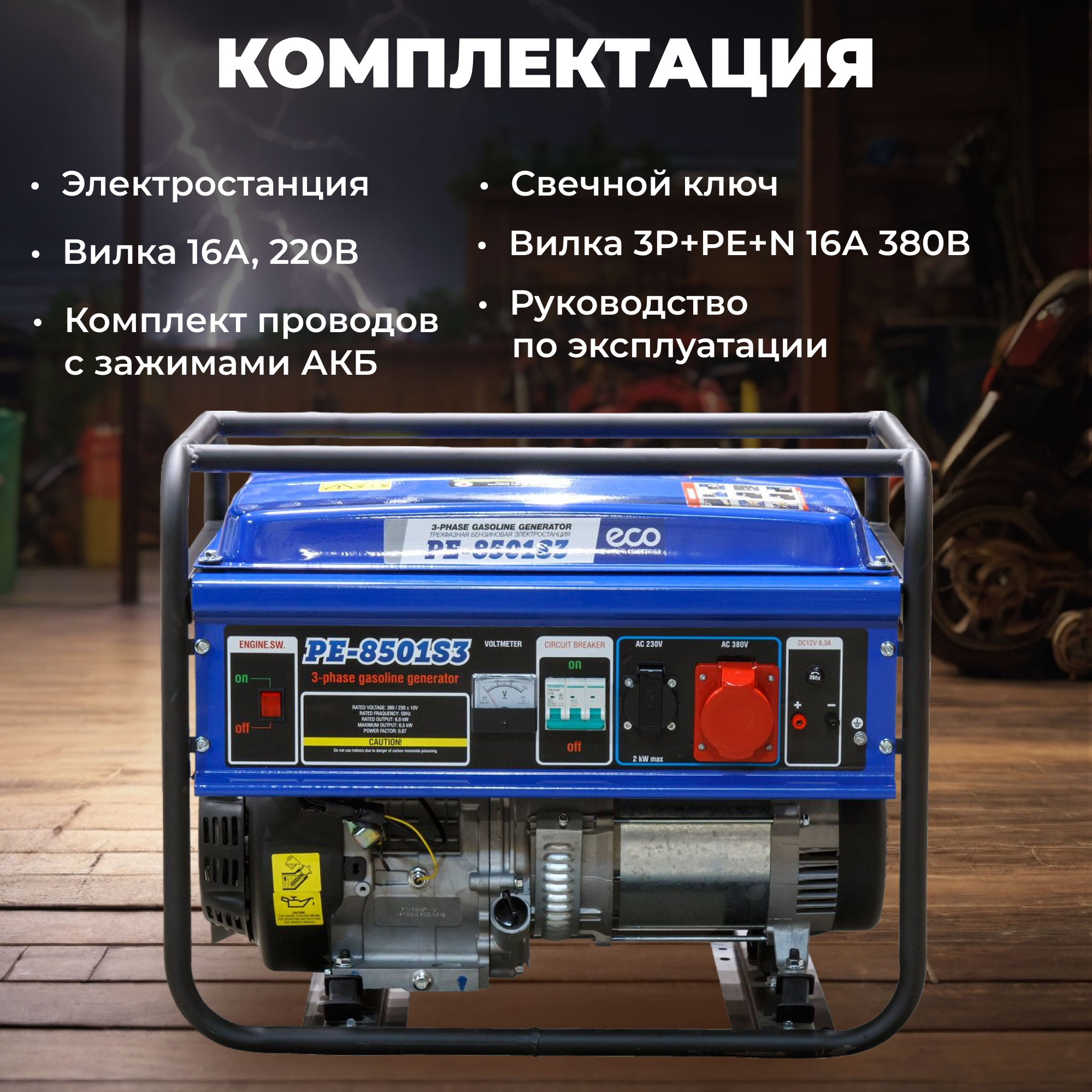 Генератор бензиновый ECO (6500 Вт, 15 л.с, 3-х фазный, (PE-8501S3))
