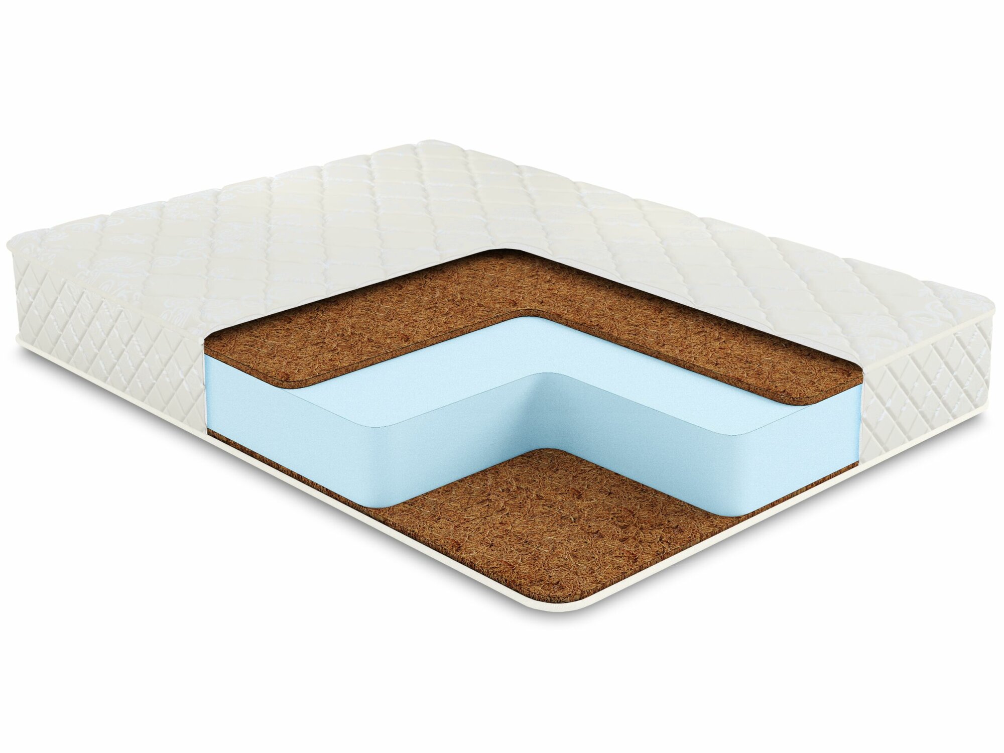 | Плюсы: | Действительно жесткий матрас, жесткость которого обусловлена пенополиуретаном средней жесткости и латексированным волокном кокоса. Всё вместе выглядит солидно и несильно отличается от жесткости пола. |