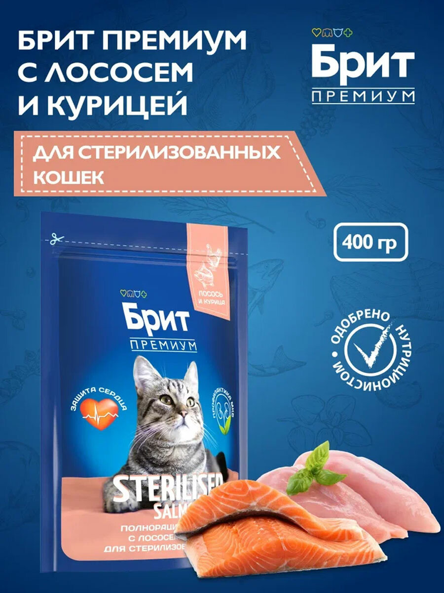 BRIT PREMIUM CAT STERILISED SALMON & CHICKEN для взрослых кастрированных котов и стерилизованных кошек с лососем и курицей (0,4 + 0,4 кг) интересное: