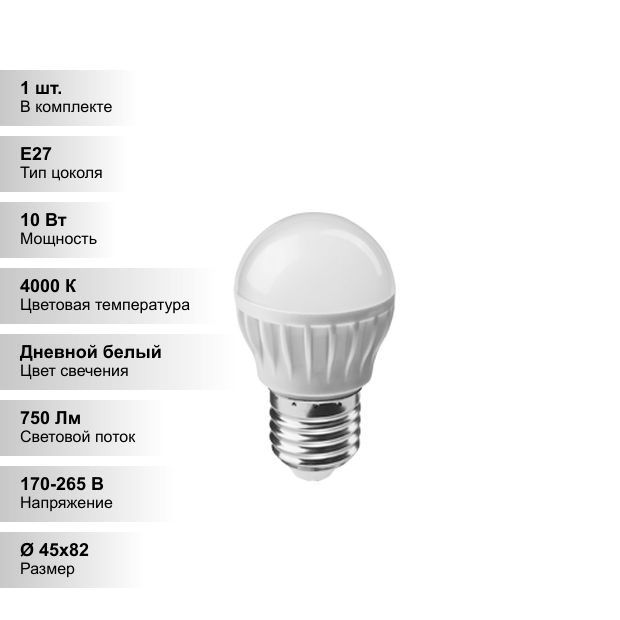 Онлайт промо шар G45 E27 10W (750lm) 4000K 4K 78x45 OLL-G45-10-230-4K-E27-PROMO, 82913