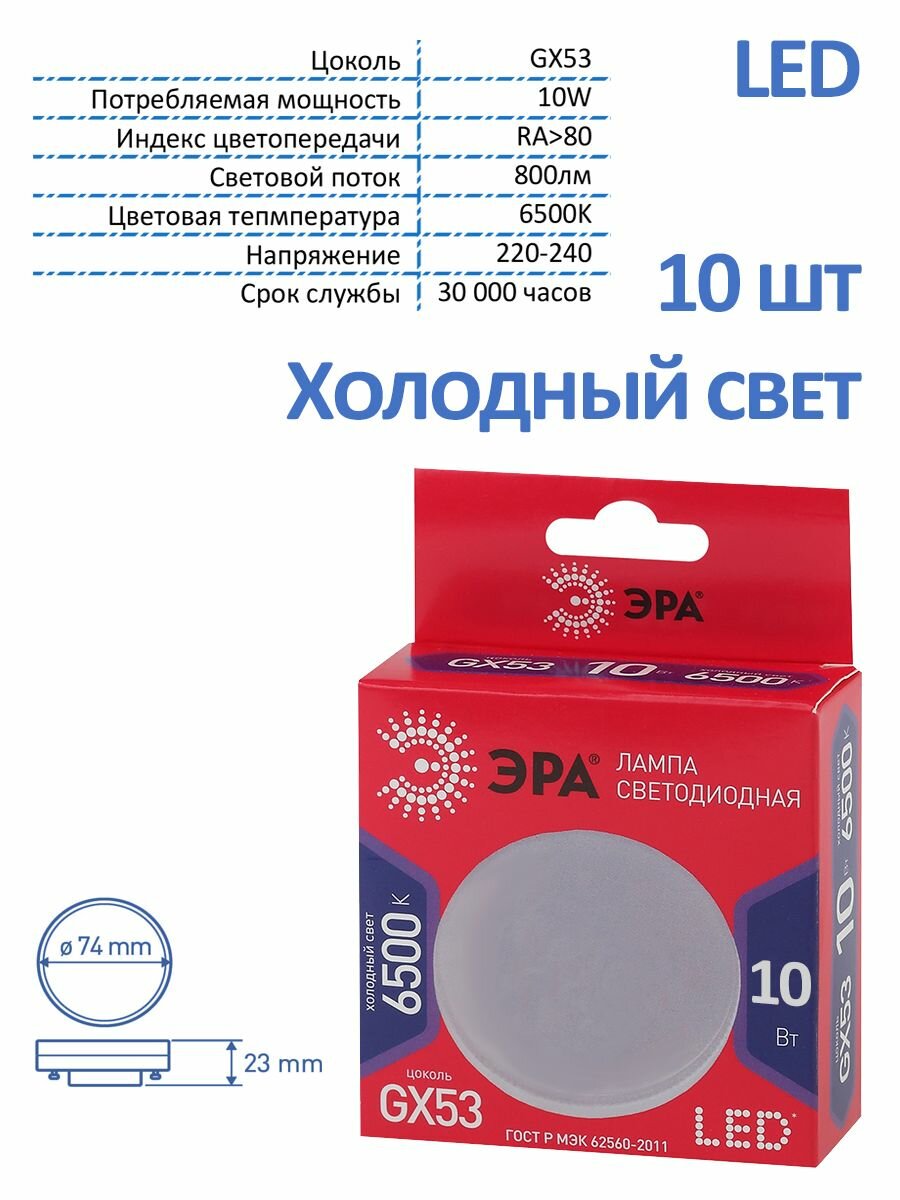 (10 шт.) Светодиодная лампочка ЭРА ECO GX53 10W(800lm) 6500K 6K 29х75 GX-10W-865-GX53 5499 Холодный белый. Цоколь GX53