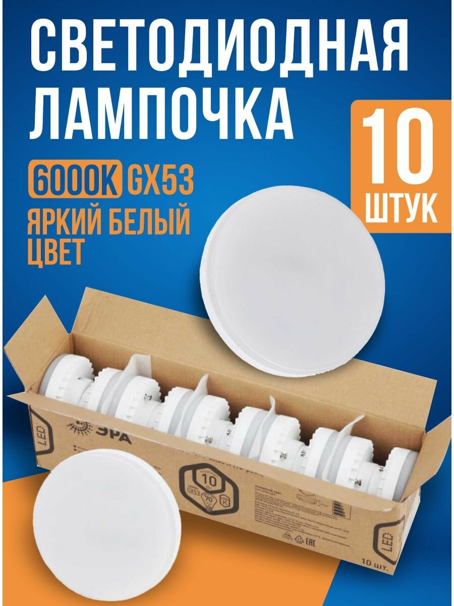 (10 шт.) Светодиодная лампочка ЭРА стандарт GX53 7W(560Lm) 6000K 6K 22х75 8969 Холодный белый. Цоколь GX53