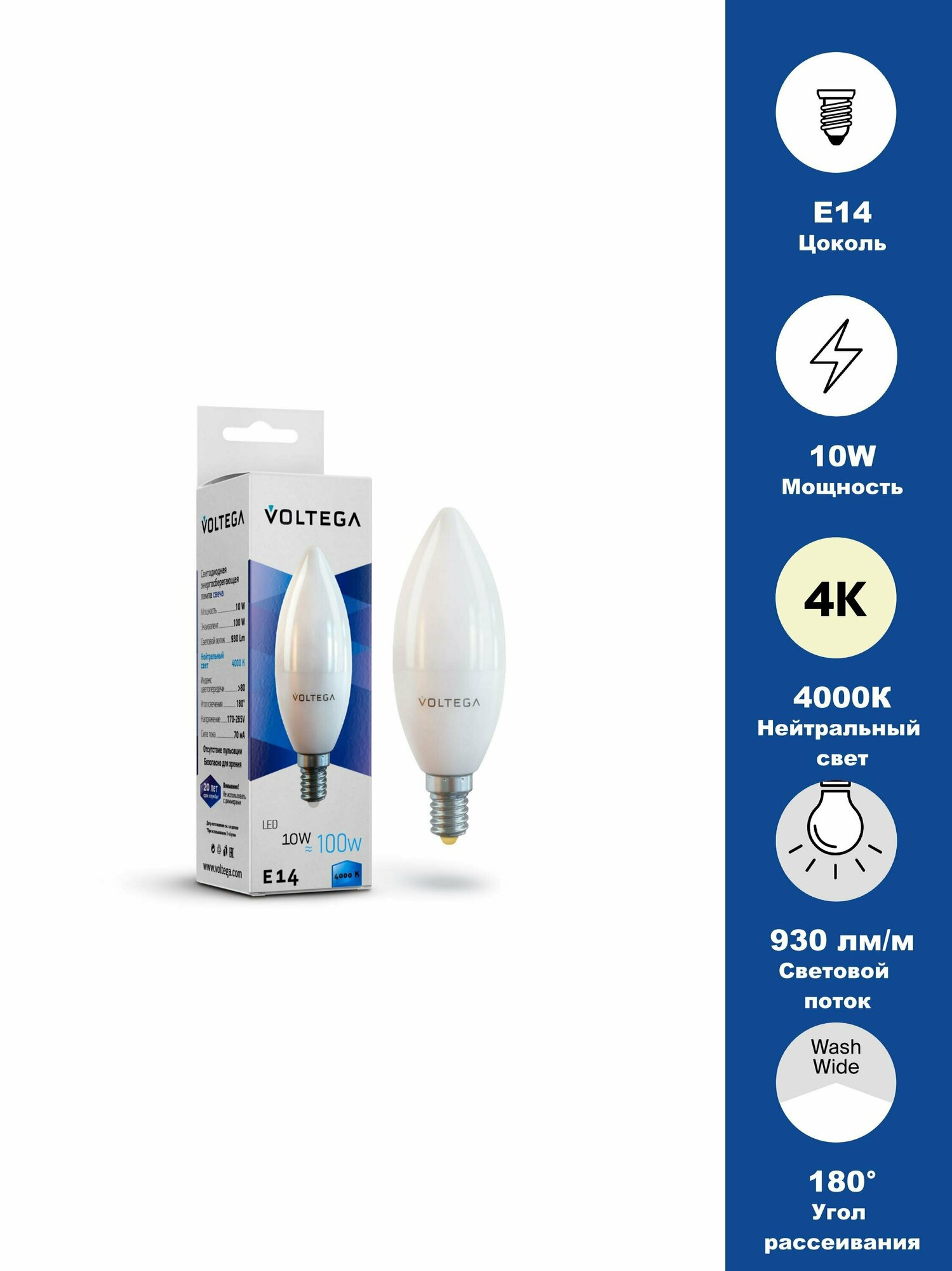 Лампочка светодиодная E14 форма свеча 10W нейтральный белый Voltega Simple Candle 4000K упаковка 10 штук