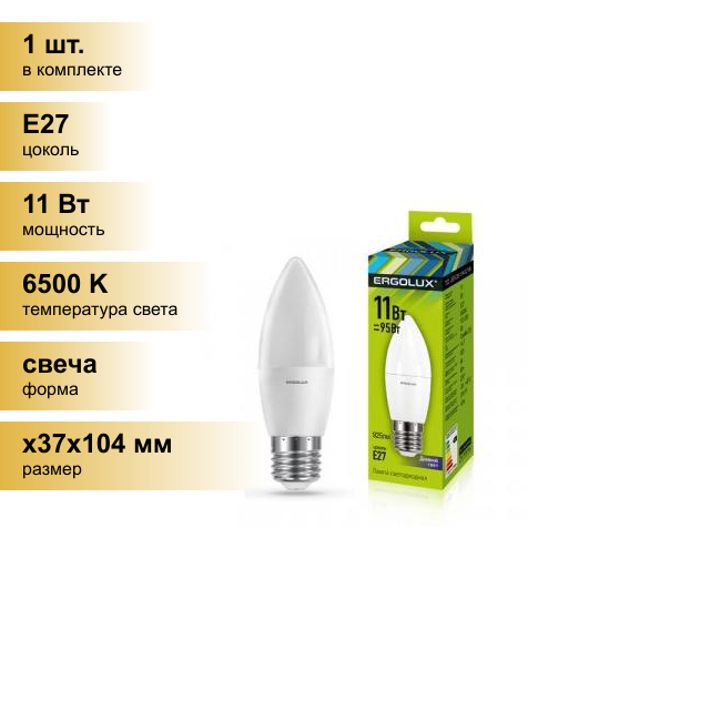 (Эл.лампа светодиодная Свеча 11Вт E27 6500K 180-240В), ERGOLUX LED-C35-11W-E27-6K (10 шт.)