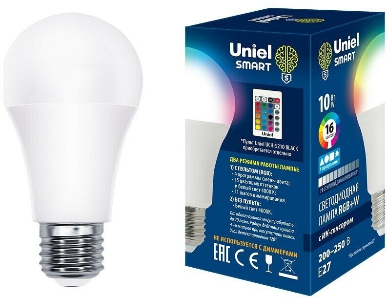 СохранитьТипы/Лампочки/Светодиодные Uniel LED-A60-10W/RGB/E27/REG PLS21WH Лампа светодиодная с ИК сенсором. Форма "А", матовая. RGB свет. Пульт ДУ (н/к). Картон. ТМ Uniel интересное: