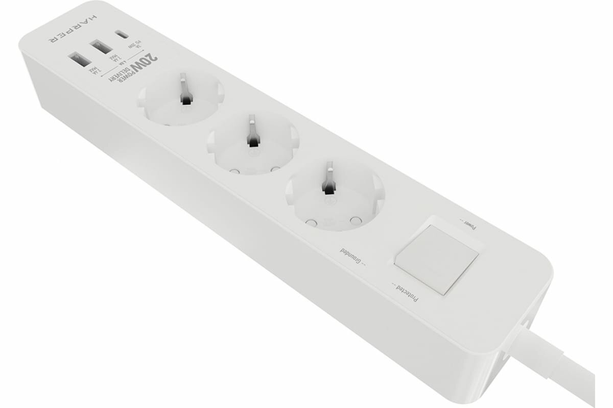 Сетевой фильтр Harper UCH-440 white PD3.0 (3 розетки, 2 USB-порта, 1 порт Type-C, 5 метра, шторки, встроенная защита от скачков напряжения и тока)
