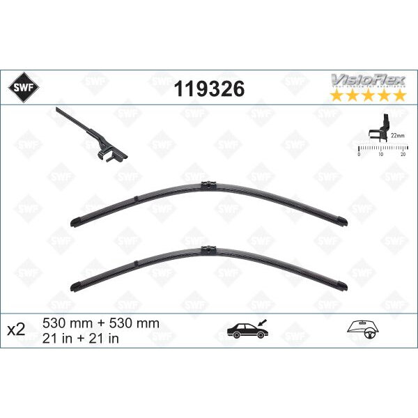 SWF 119326 Комплект щеток стеклоочистителя VISIOFLEX бескаркасных 530/21`+530/21` (боковой штырь) | перед |