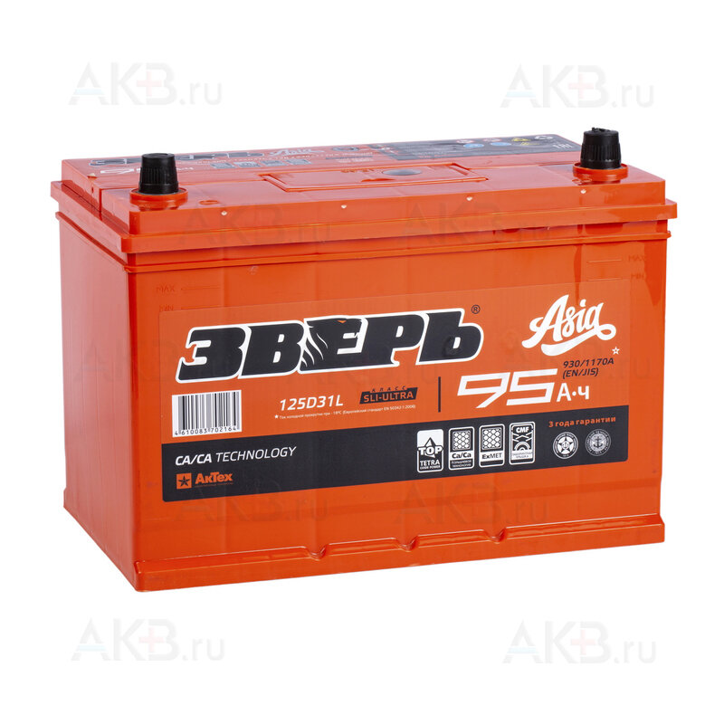 Аккумулятор автомобильный Зверь Asia 95 А/ч 930 А обр. пол. 125D31L Азия авто (305x175x221) с бортиком