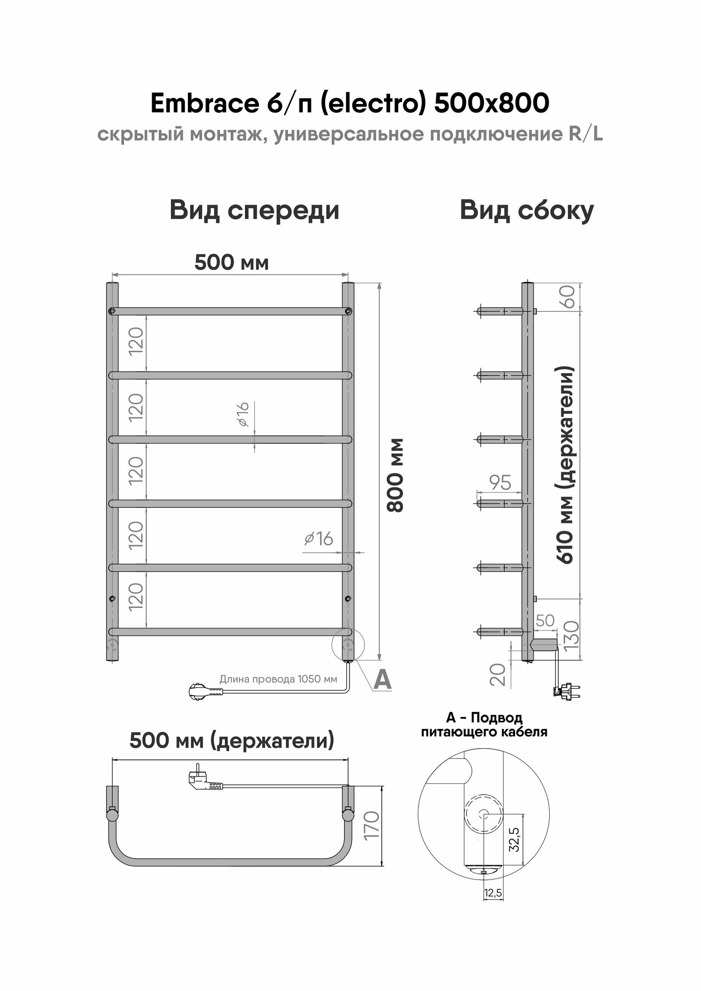Полотенцесушитель электрический INDIGO Embrace, без полки, 800*500, скрытый монтаж, универсальное подключение, цвет хром