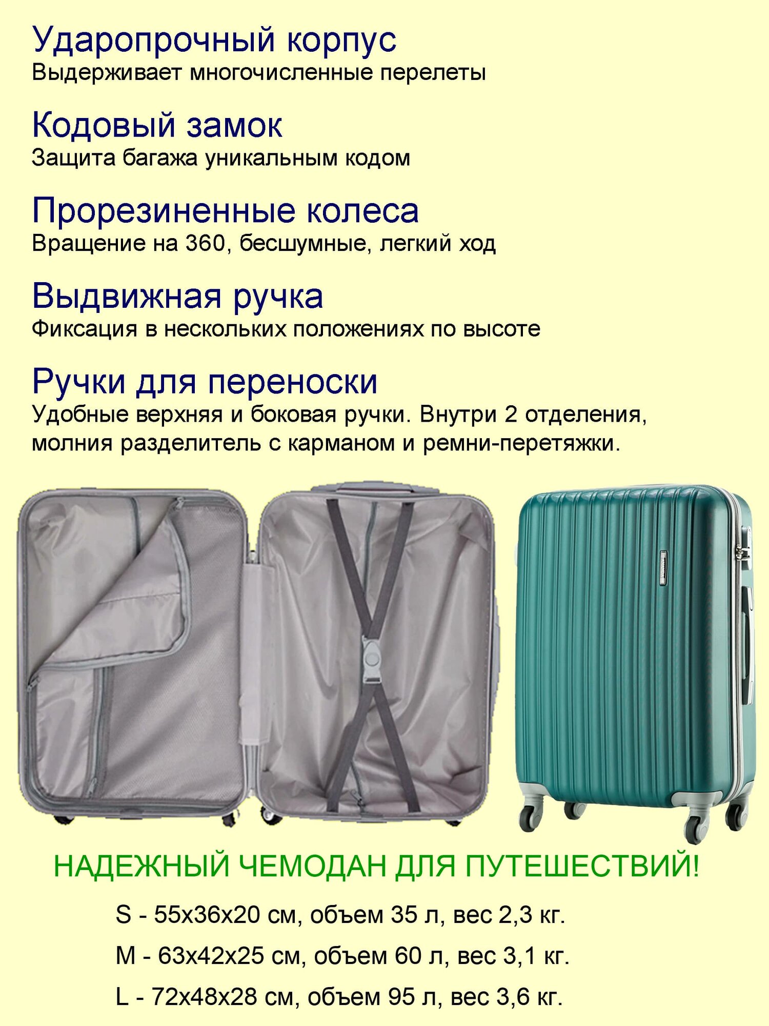 | Особенности конструкции | рифленая поверхность, колеса 360,ручка чемодана меняет высоту,замок с кодом |