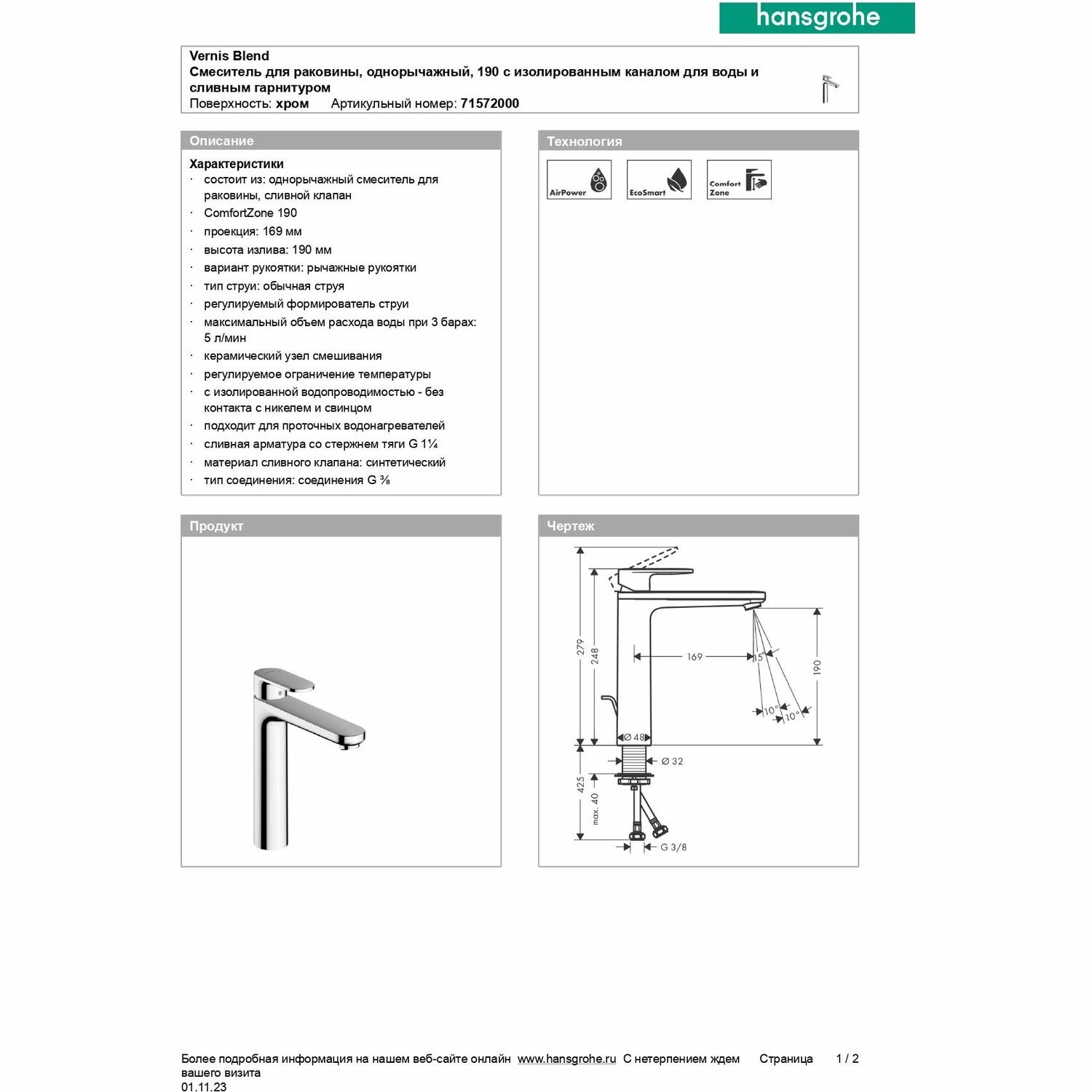 Смеситель для раковины hansgrohe Vernis Blend 190, со сливным гарнитуром 71572000, хром