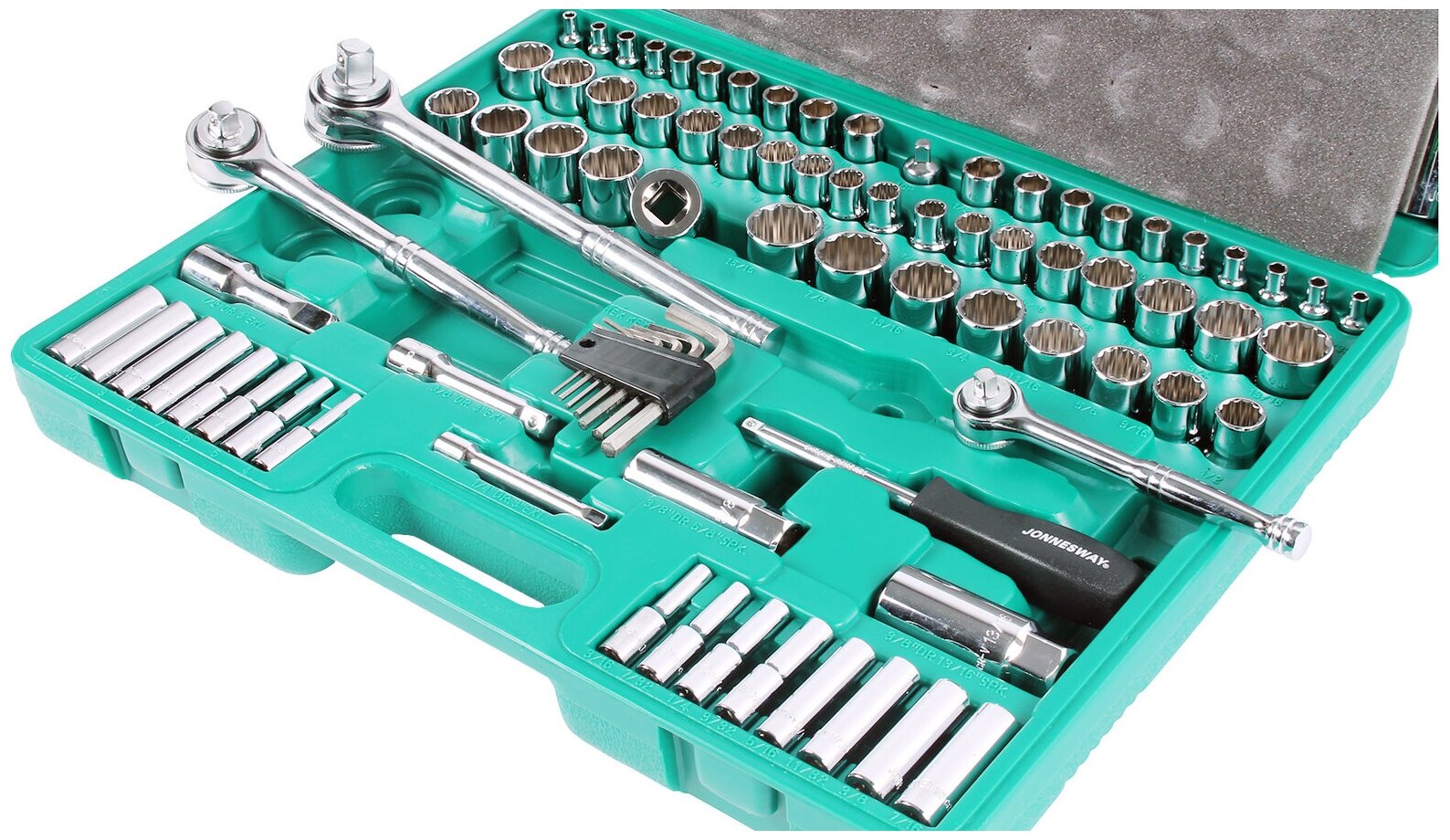 JONNESWAY S05H48107S Универсальный набор торцевых головок 1/4. 43315 и 1/2"DR (дюйм 5/32"-15/16" и метрика 44652 мм). мм). угловых ключей 5/64"-1/4". 107 предметов 48055