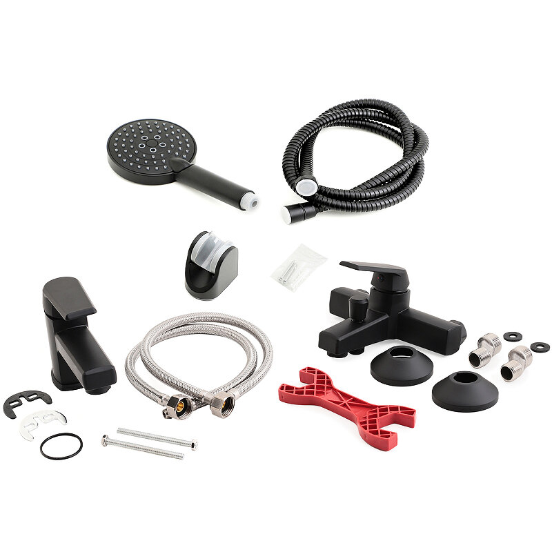 | Комплектация | Смеситель для ванны, смеситель для раковины, лейка, шланг, держатель, инструкция, гарантийный талон |
