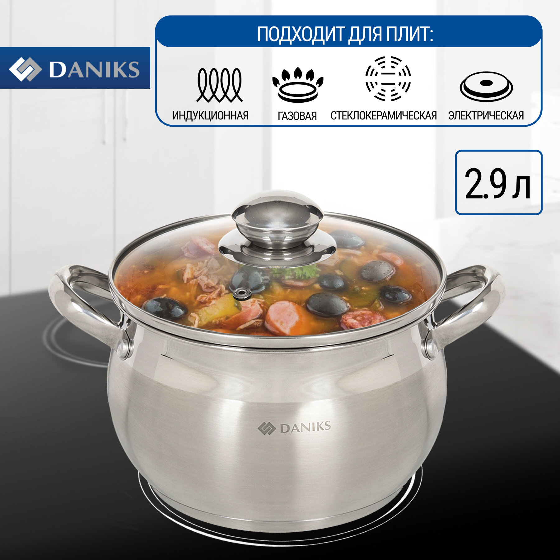 Купить Кастрюля нержавеющая сталь, 2.9 л, с крышкой, крышка стекло, Daniks, Классика, SD-18