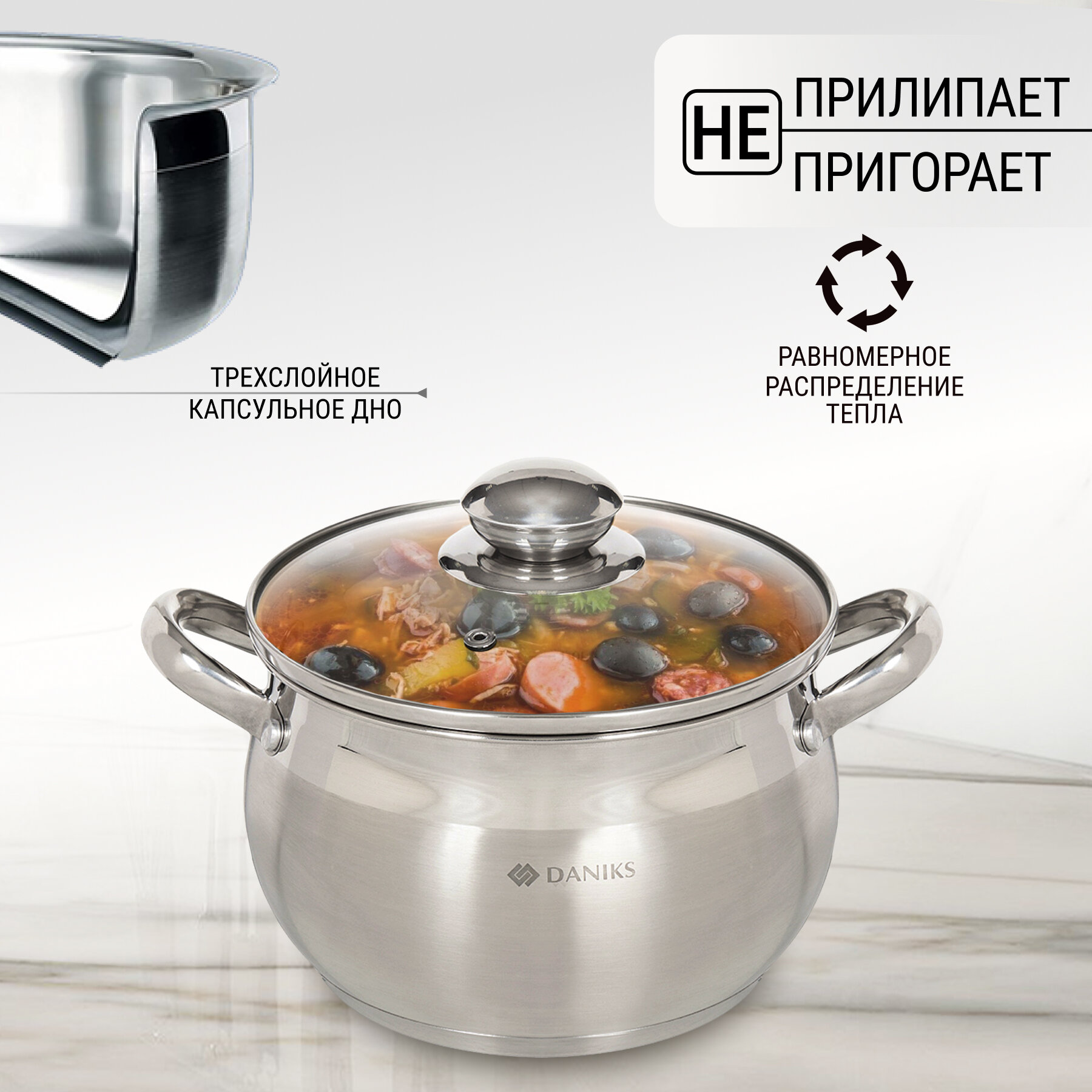 Кастрюля нержавеющая сталь, 6.5 л, с крышкой, крышка стекло, Daniks, Классика, SD-24, индукция