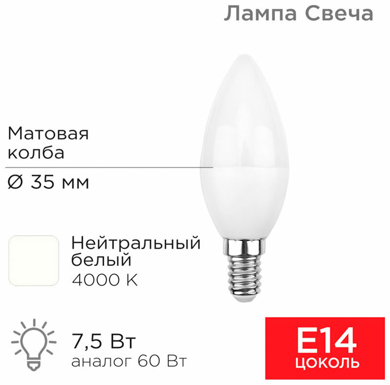 Лампа светодиодная Rexant Свеча, Е14, 7,5 Вт, 4000 К, нейтральный свет
