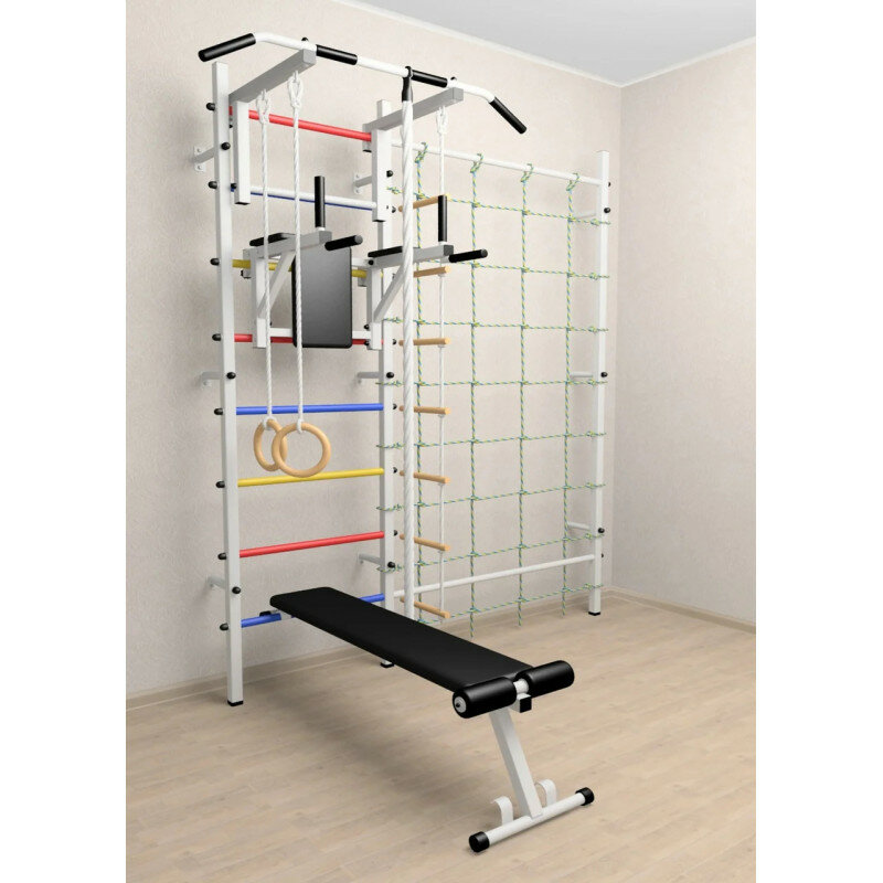 Шведская стенка Sv Sport усиленная 611б (ступени Белые / Турник стандарт к ШС / Канат, кольца, лестница / Брусья Sv Sport к ШС / Скамья для пресса и жима к ШС / Комплект с канатным лазом к ШС)
