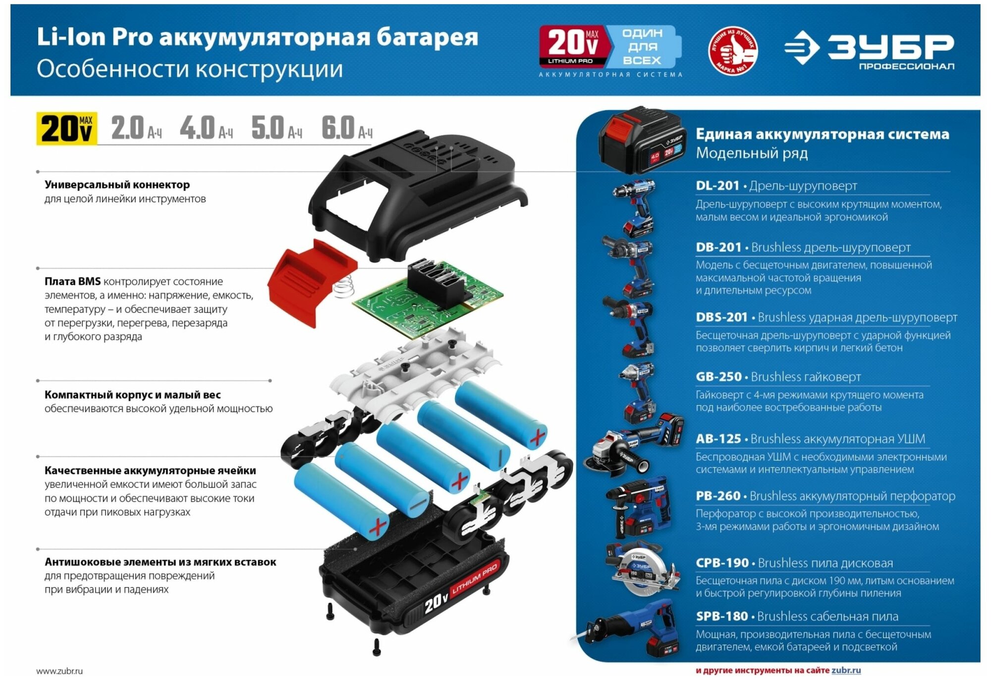 | Аккумуляторная система | ЗУБР 20V MAX Lithium PRO |