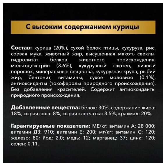 | Состав | курица (20%), сухой белок птицы, кукуруза, рис, соевая мука, животный жир, высушенная мякоть свеклы, гидролизат белков животного происхождения, мальтодекстрин (3.6%), кукурузный глютен, яичный порошок, минеральные вещества, кукурузная крупа, рыбий жир, бентонит, витамины, сухое моловизо (0.1%), антиоксиданты (токоферолы природного происхождения) |