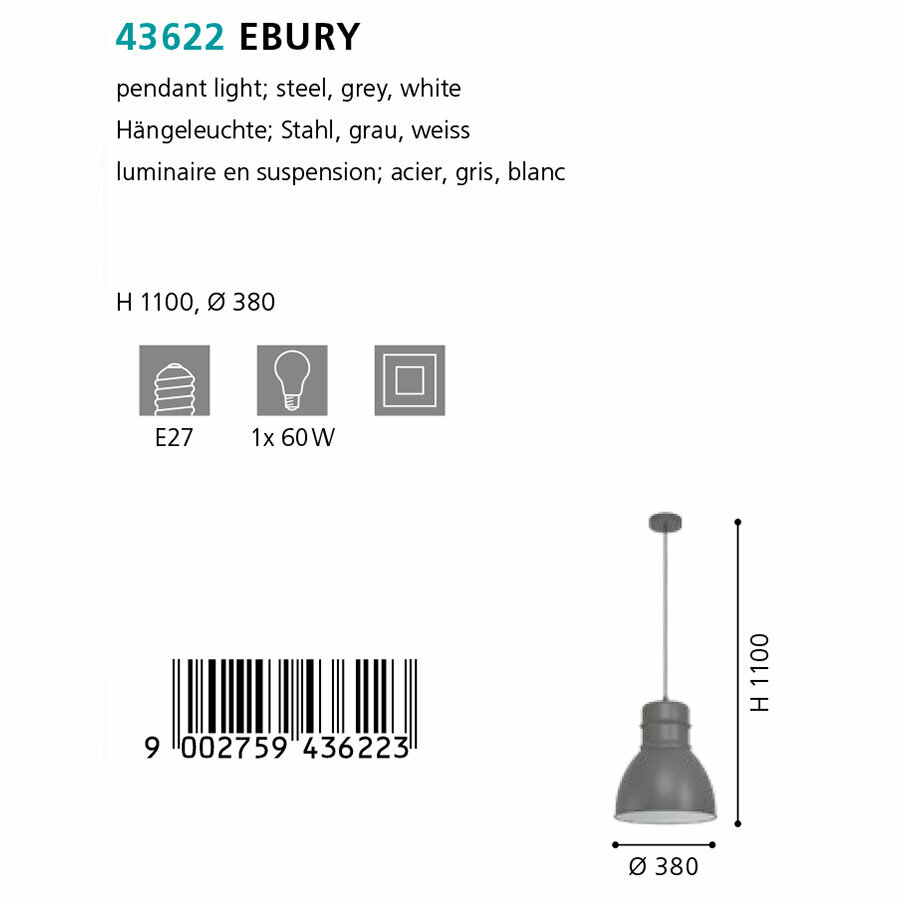 Купить 43622 Подвесной потолочный светильник (люстра) EBURY, 1Х60W, E27, H1100, Ø380, сталь, серый/б