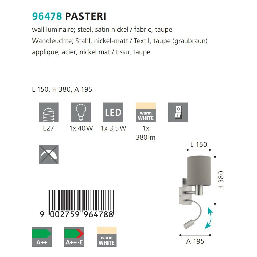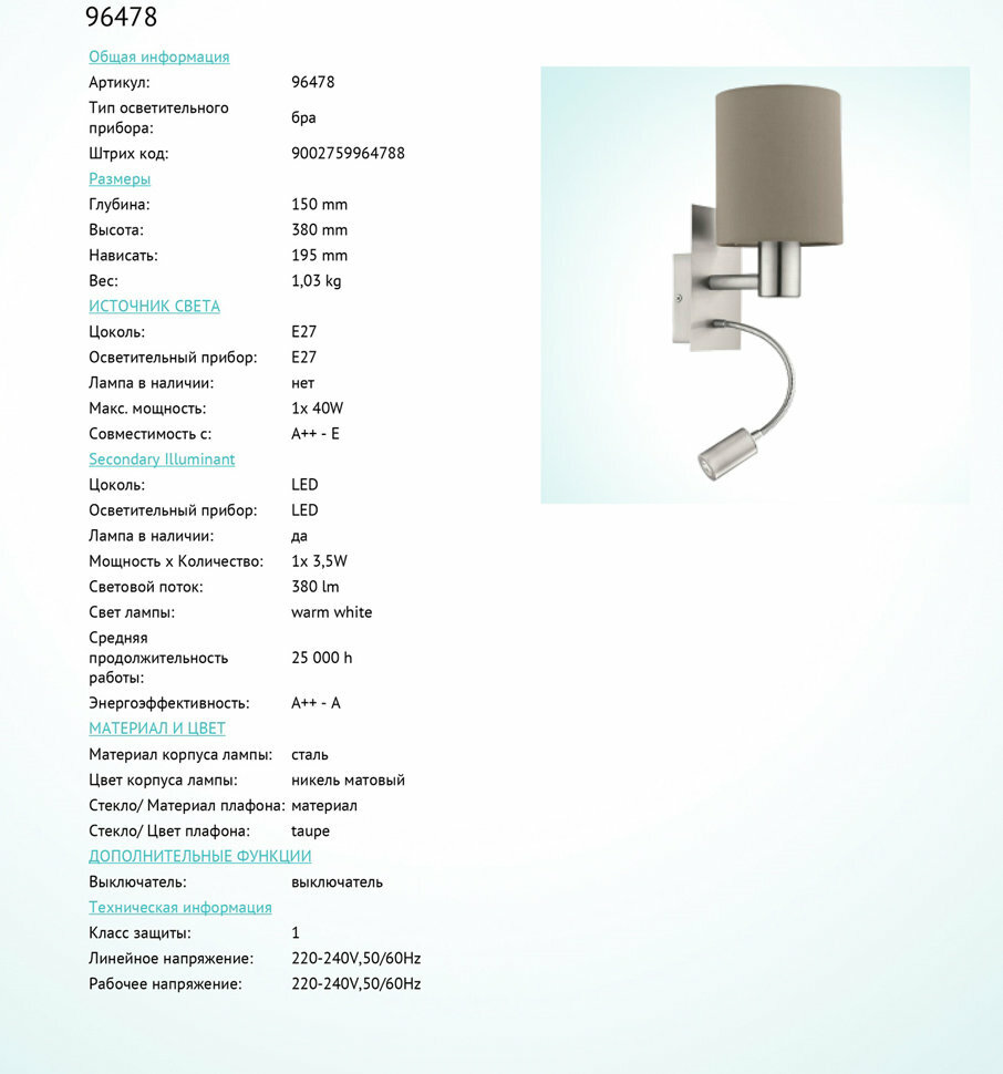 Ниже Вы можете прочитать отзывы на Бра EGLO PASTERI 96478, ознакомится с подробными характеристиками, посмотреть интересные обзоры и фотографии на Бра EGLO PASTERI 96478.
