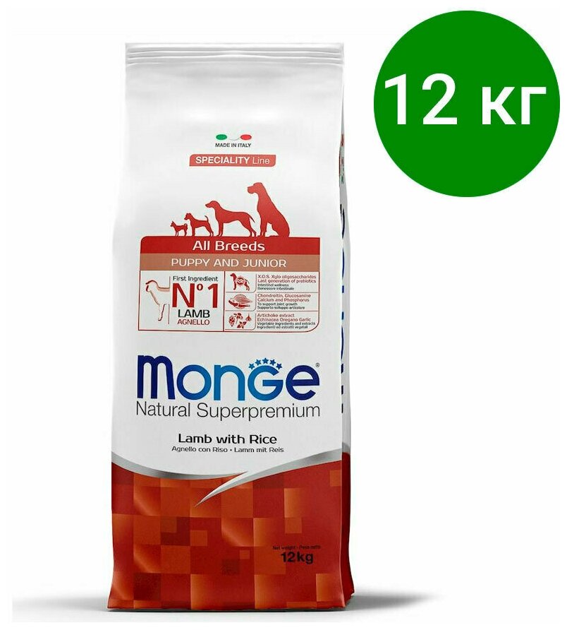 Корм Monge Speciality Line Puppy And Junior All Breeds для щенков всех пород, с ягненком и рисом 12кг