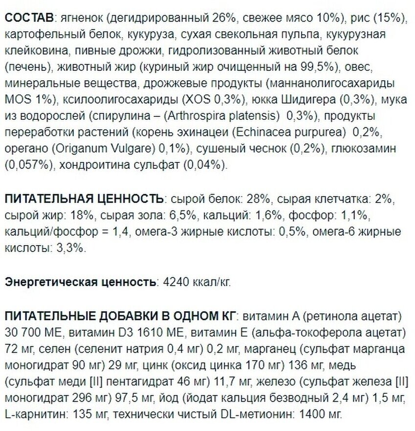 | Состав | ягненок, рис, картофельный белок, кукуруза, сухая свекольная пульпа, кукурузная глютеновая мука, пивные дрожжи, гидролизованный животный белок, животный жир, овес, ксило-олигосахариды, гидролизованные дрожжи, юкка Шидигера, спирулина, гидролизованные хрящи, гидролизованные ракообразные, метилсульфонилметан, экстракт корня эхинацеи, экстракт орегано, порошок сушеного чеснока |