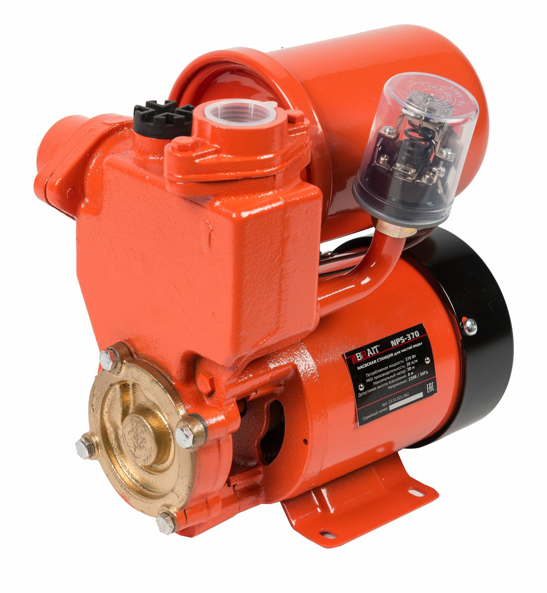 Насосная станция BRAIT NPS-370 (Чугун, 370 Вт, гидробак 2 литра, напор 30 м, подача воды 30л/мин.)