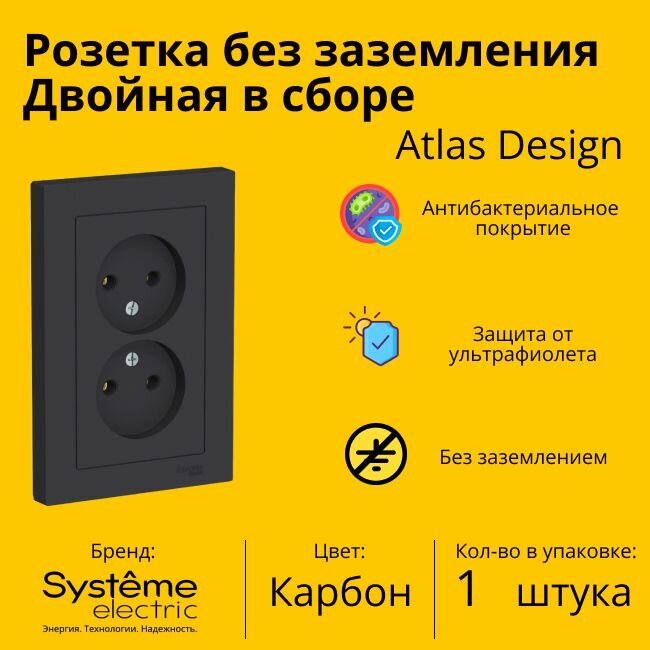 Купить Розетка ATLASDESIGN двойная без заземления,16А, в сборе, карбон