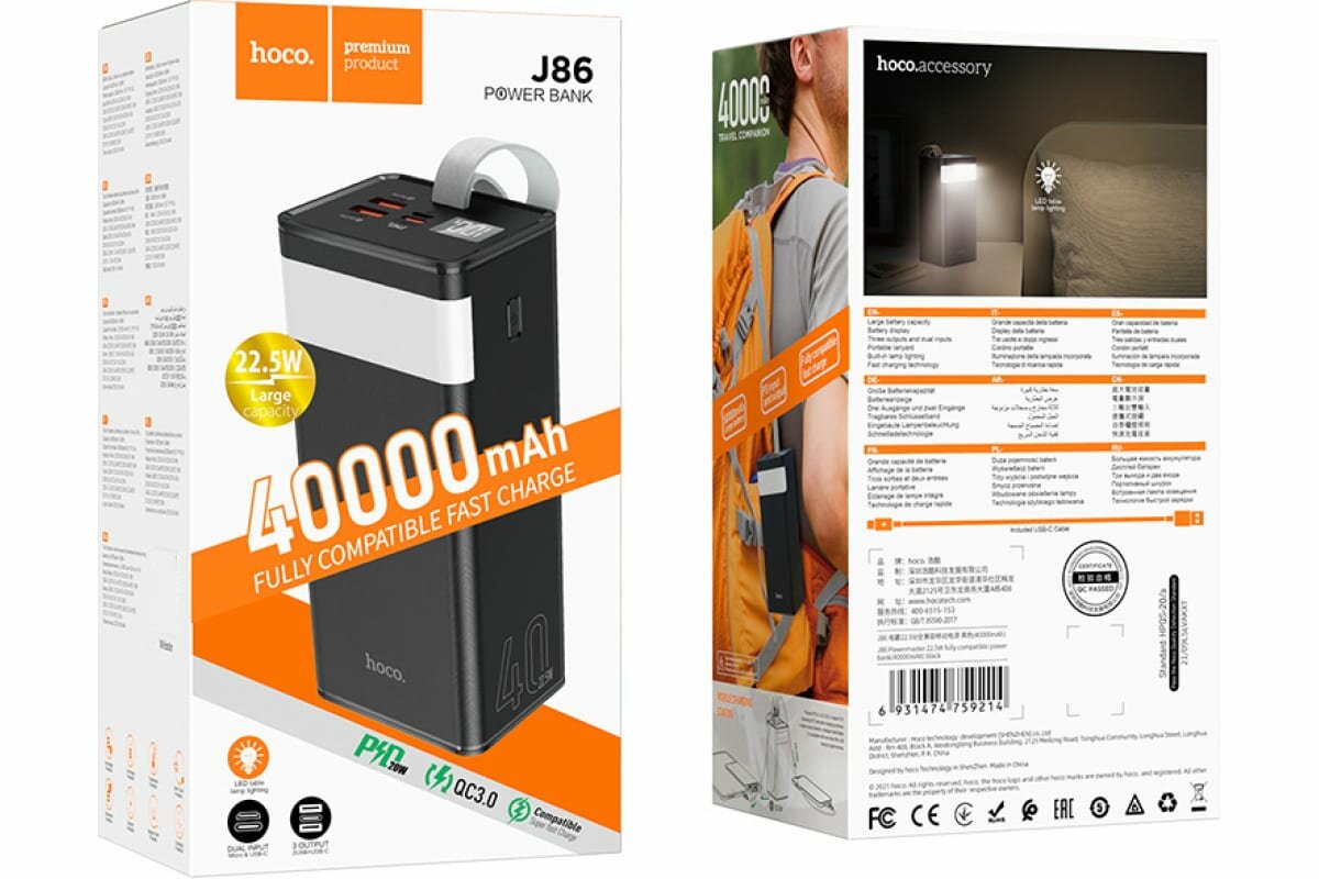 Внешний аккумулятор HOCO J86 Power Master, 40000 mAh, 22.5W, LED дисплей, Лампа, Черный