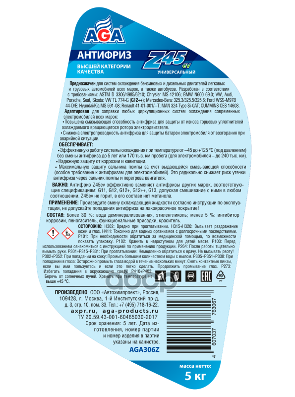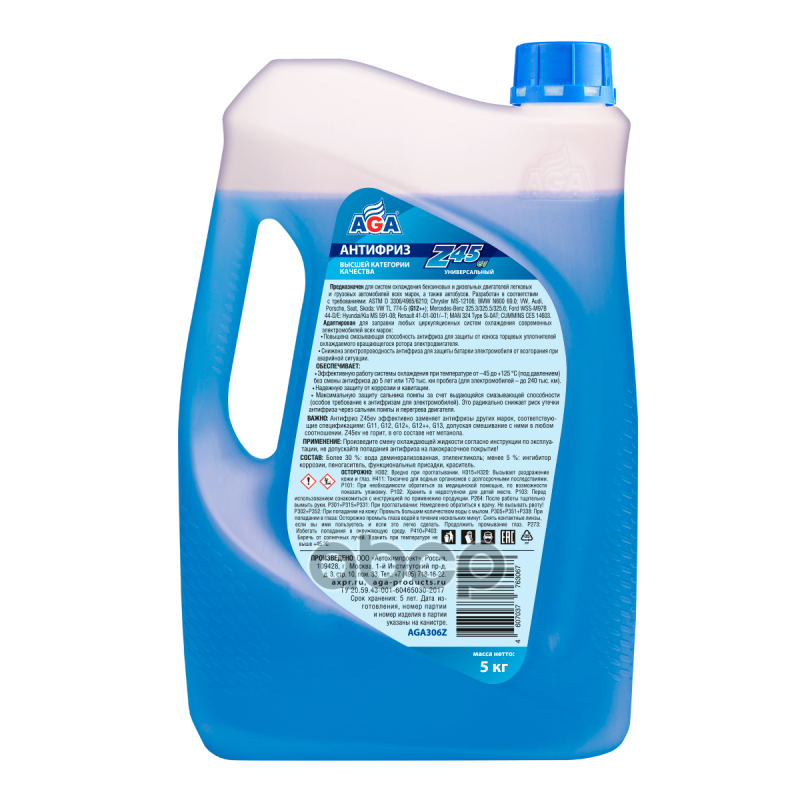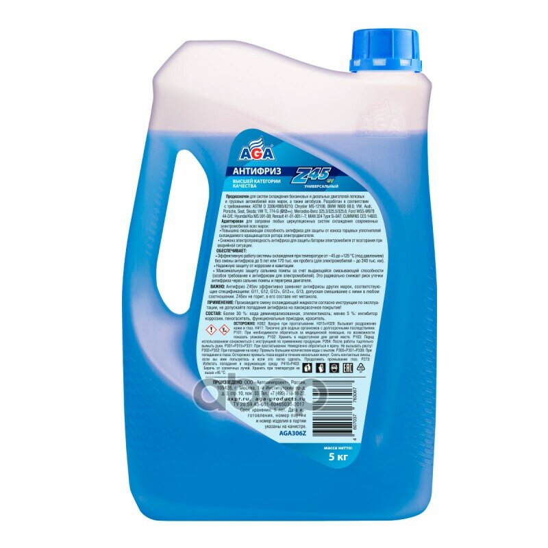 Антифриз Aga Z45 G12++ Готовый -45C Синий 5 Кг Aga306z (Допуск Для Электромобилей) AGA арт. AGA306Z интересное: