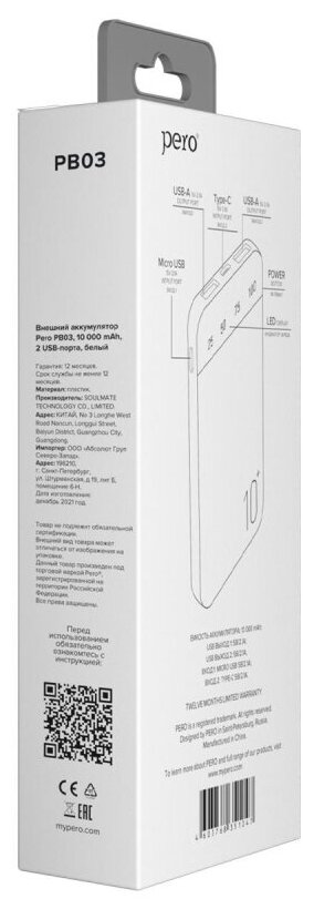 Купить Внешний аккумулятор Pero Pb03, 10000 мАч, 2 Usb, 2.1 А, индикатор, белый Pero 9568360