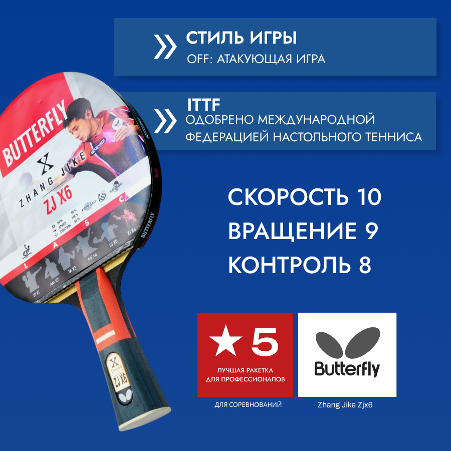 Ниже Вы можете прочитать отзывы на Ракетка Butterfly Zhang Jike Zjx6, ознакомится с подробными характеристиками, посмотреть интересные обзоры и фотографии на Ракетка Butterfly Zhang Jike Zjx6.