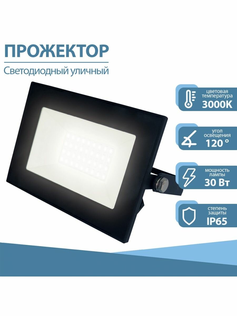Прожектор светодиодный. Uniel Теплый белый свет 3000К. ULF-F21-30W-3000K IP65 200-250В BLACK Корпус черный UL-00007732