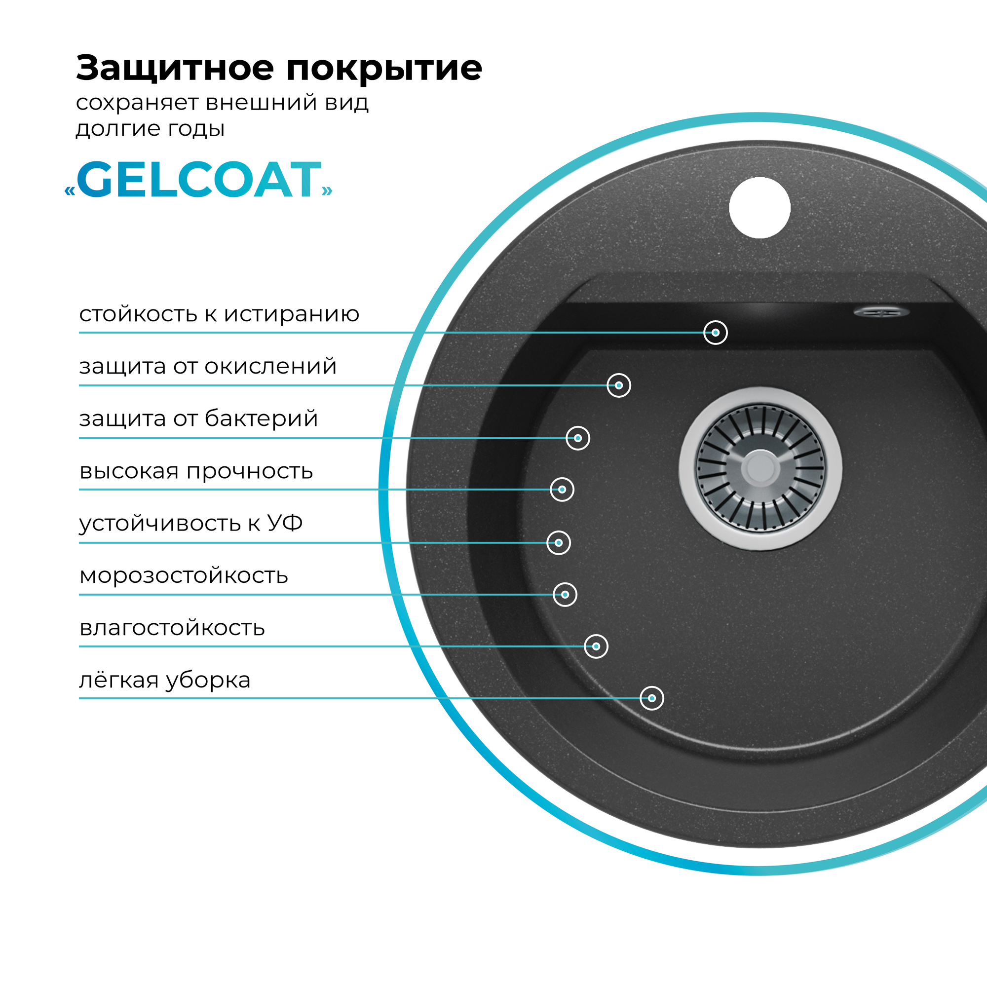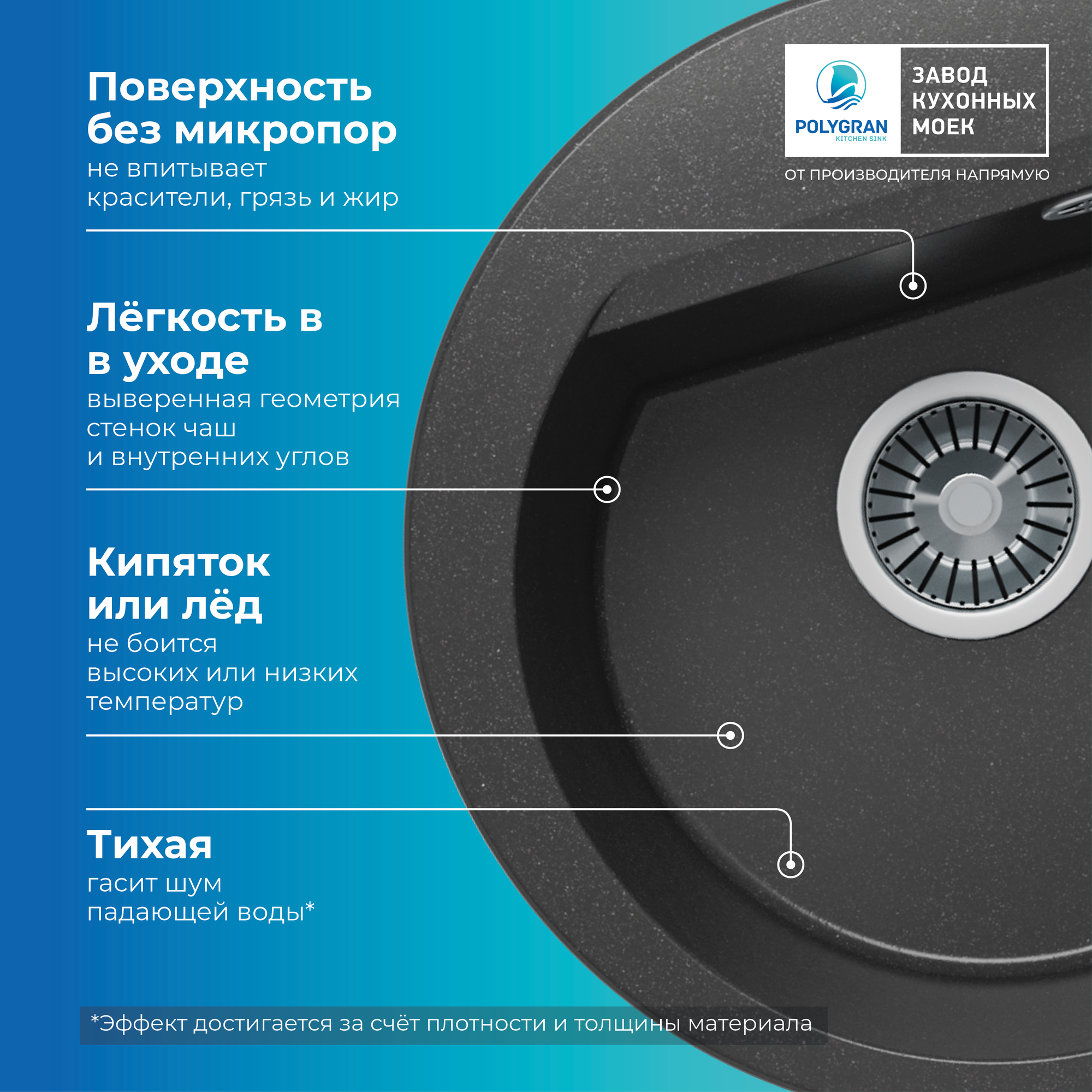 Мойка для кухни POLYGRAN ATOL-460 каменная, врезная, раковина кухонная, круглая с отверстием под смеситель (№16 Черный)