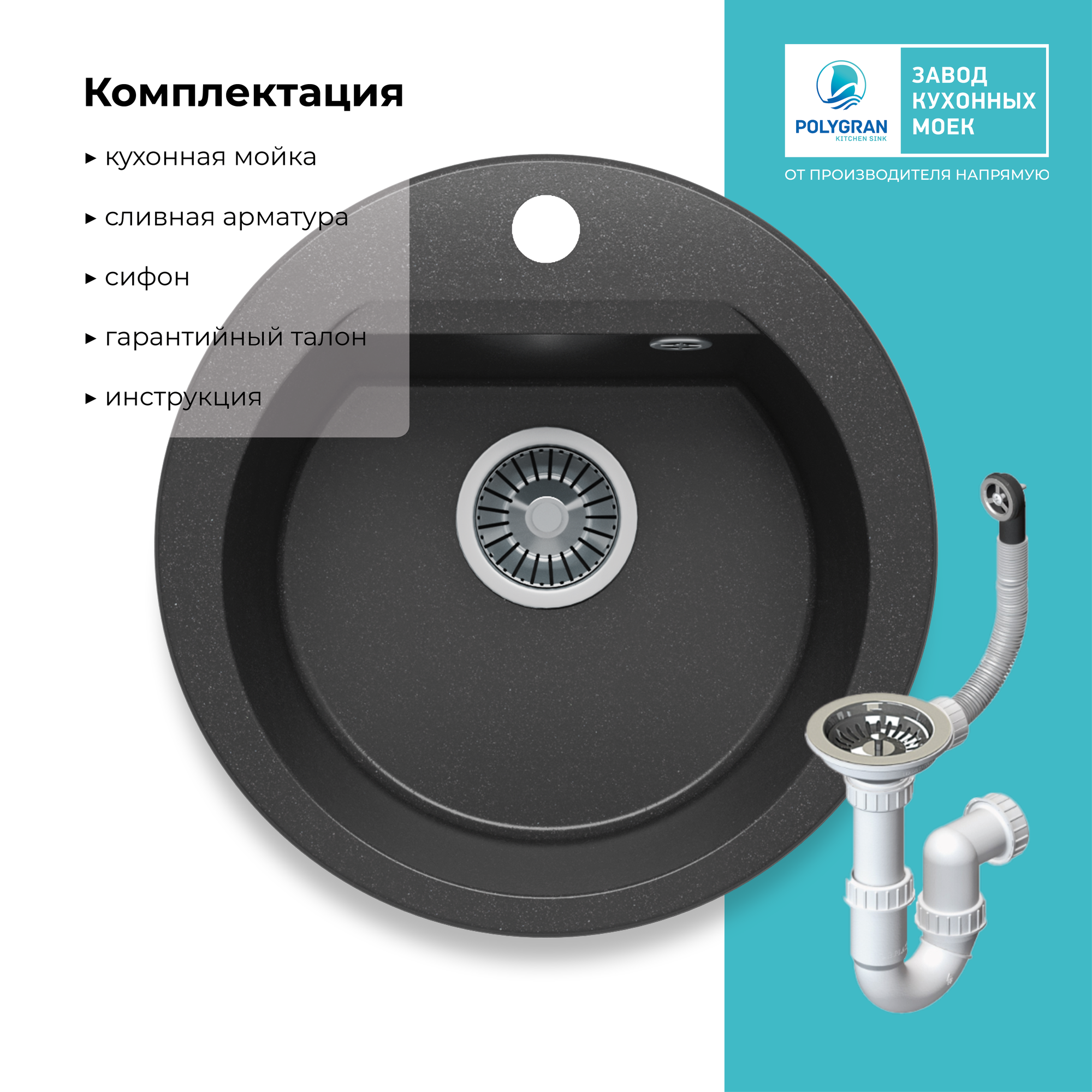 Мойка POLYGRAN, гранит-мрамор, ATOL-460, (d=460*200 мм), черный, сифон и сливная арматура