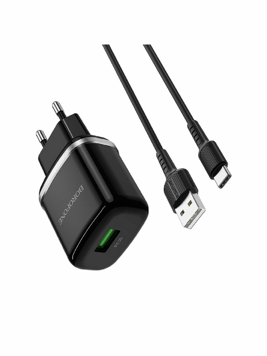 Сетевой адаптер питания USB-Af + кабель Type-Cm Borofone BA36A HighSpeed Black зарядка 3А 18W QC3.0 - чёрный