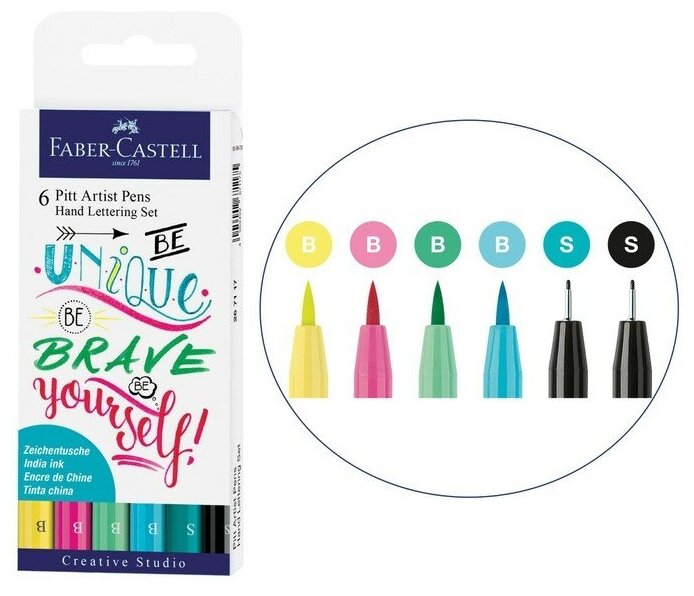 Набор капиллярных ручек Faber Castell Pitt Artist Pen Lettering, 6 цветов, 0,3 мм/Brush