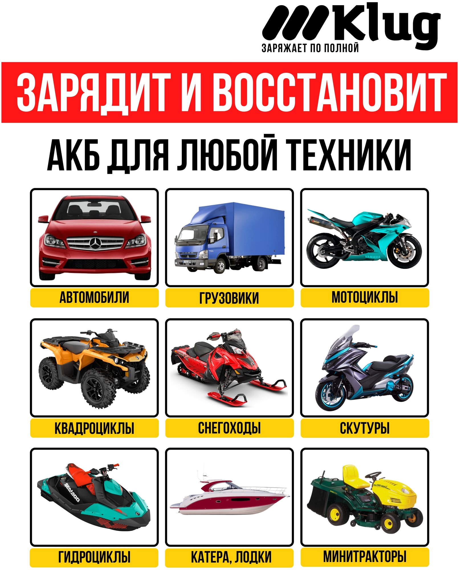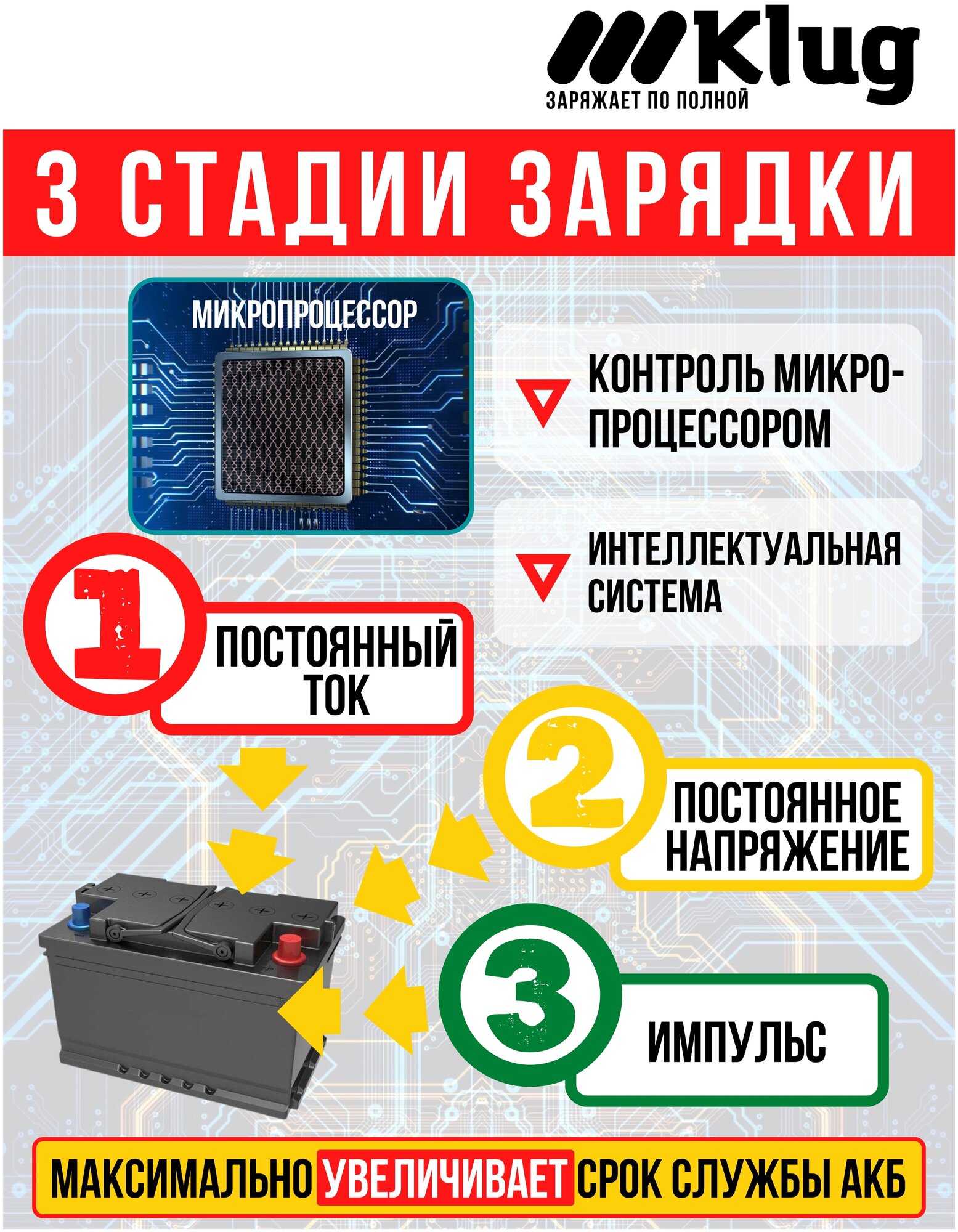 Автоматическое зарядное устройство для автомобильных АКБ всех типов, 12В/24В-8А, 4-150 Ач, импульсное ЗУ, Klug интересное: