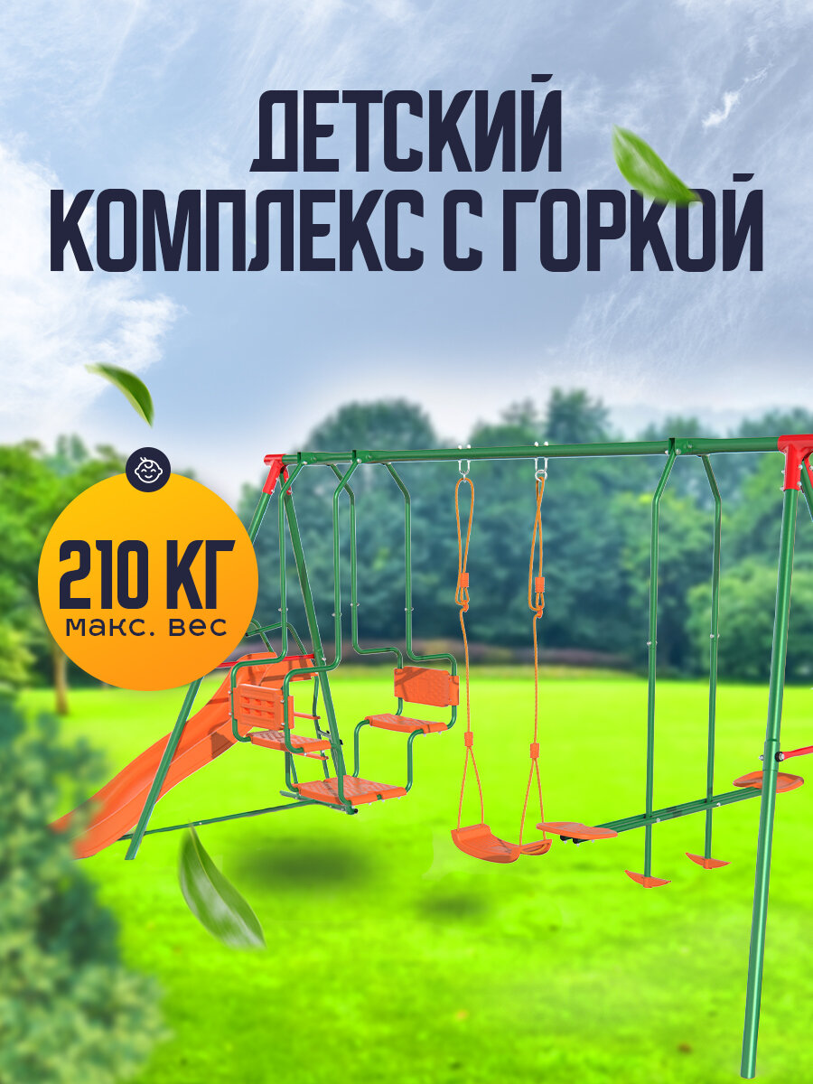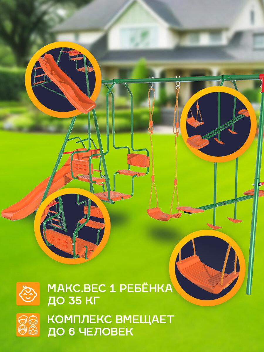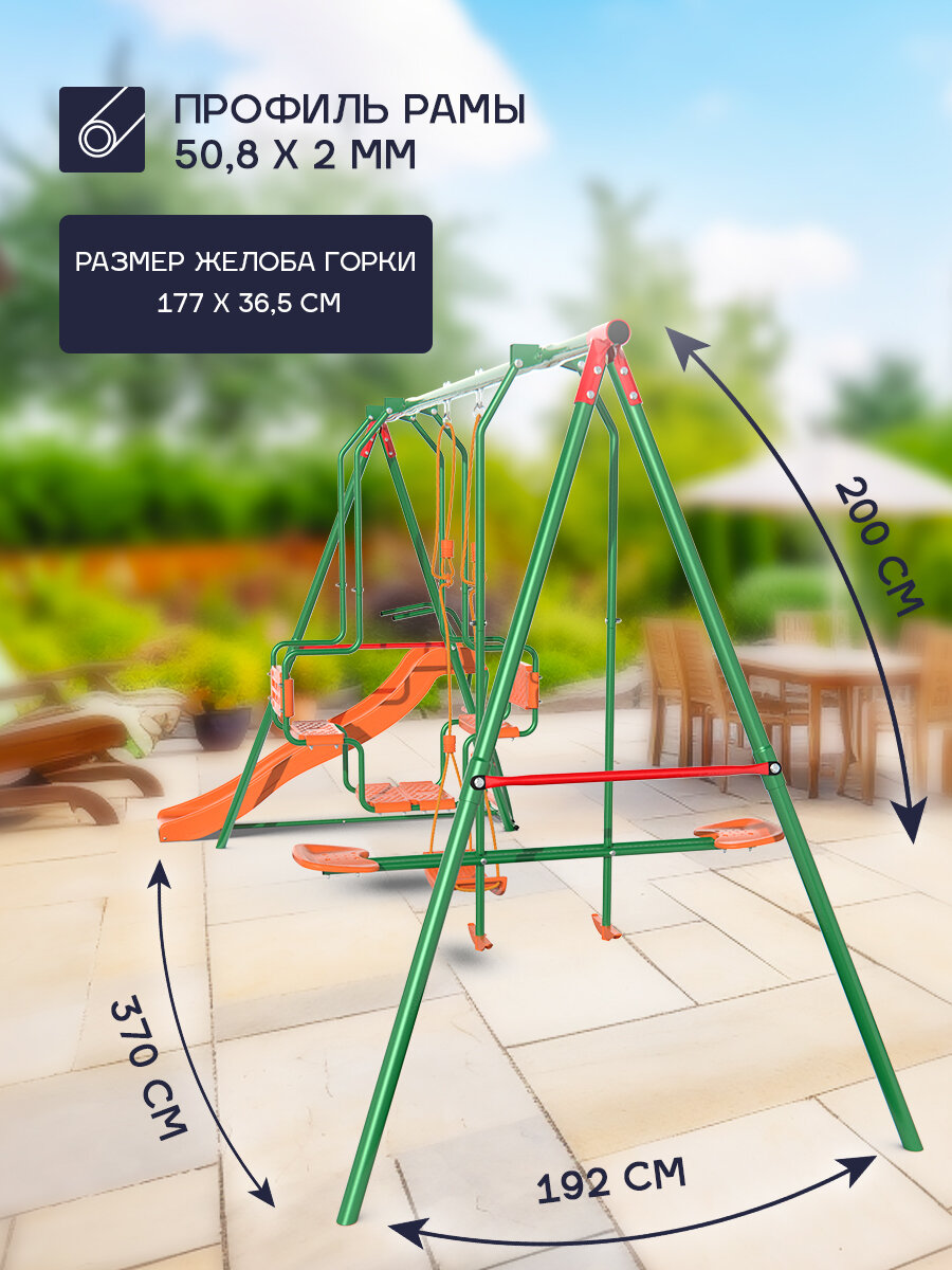 | Особенности конструкции | волнистая горка / двойные качели "Гондола" / жесткое крепление подвеса качелей / сиденье качелей со спинкой |