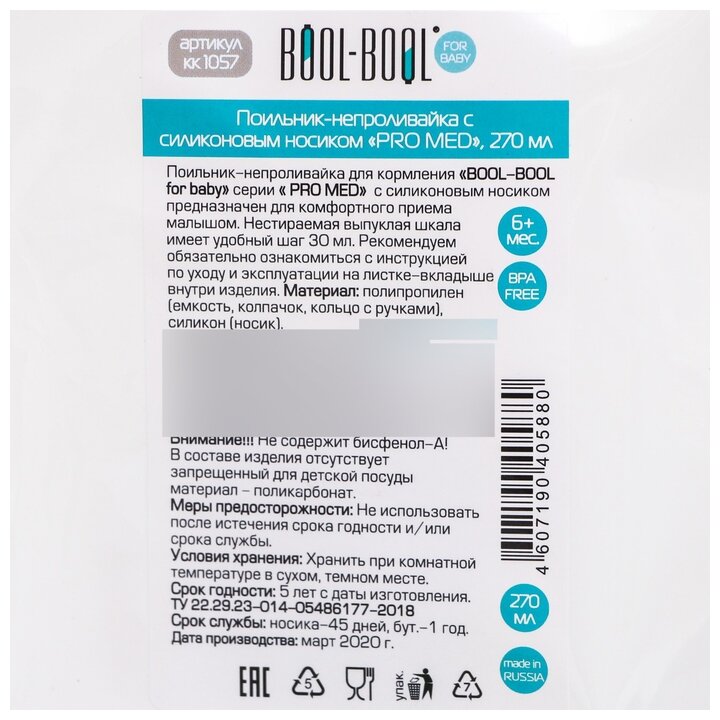 Bool-Bool Baby Поильник-непроливайка с силиконовым носиком PROMED, с ручками, 270 мл., от 6 мес.