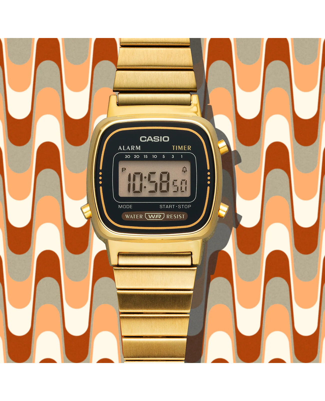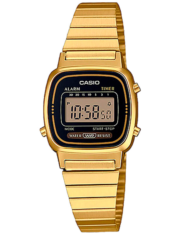 LA670WGA-9D Casio наручные часы кварцевые WR30 (3 атм) женские золотой секундомер, таймер обратного отсчета будильник отображение дня недели, отображение месяца, отображение числа акриловое стекло