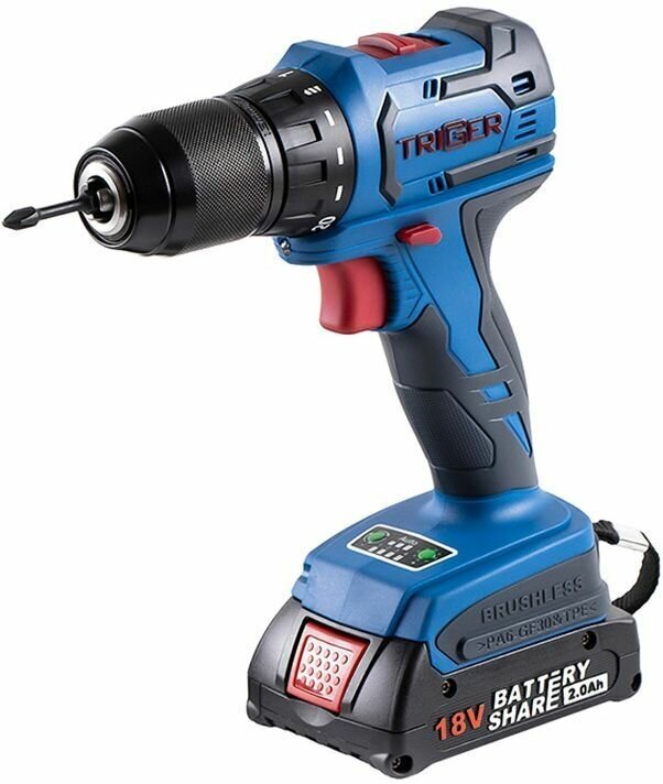 Дрель-шуруповерт Trigger 20111, бесщеточная, 2 аккумулятора, кейс, 13 мм, 18 В