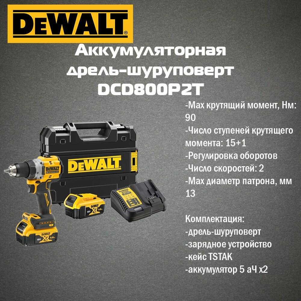 Аккумуляторная безударная дрель-шуруповерт DEWALT DCD800P2T-QW, 18 В