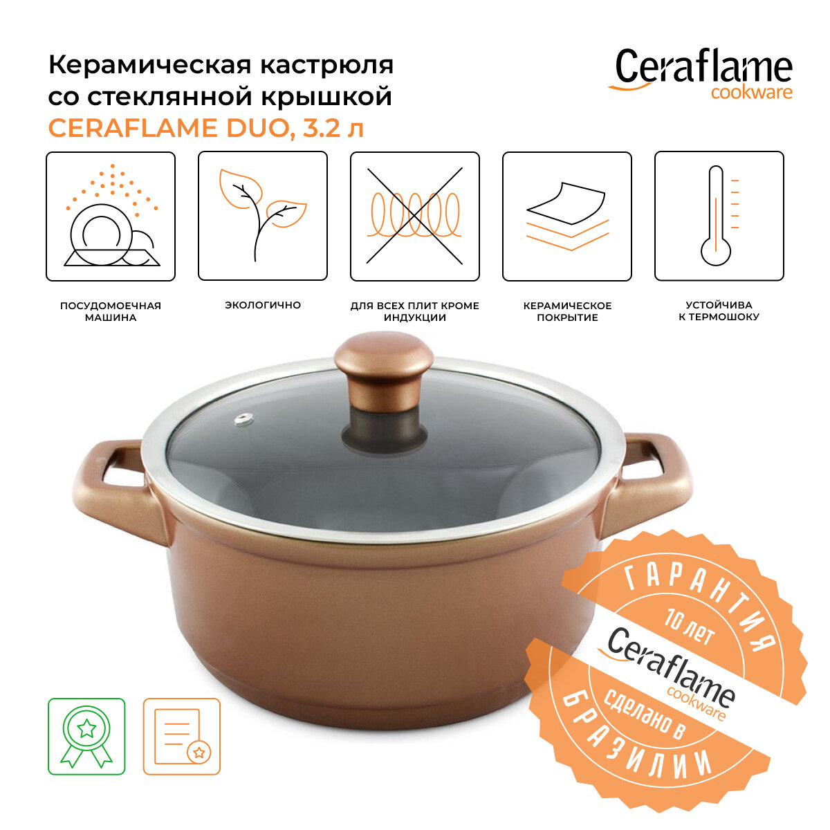 Купить Кастрюля керамическая со стеклянной крышкой Ceraflame Duo 22 см, 3.2 л, медный