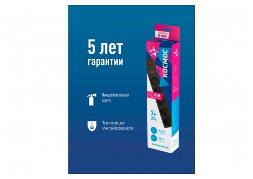Сетевой фильтр космос электро Космос 5х3м с заземл. 10А IP20 2.2кВт с пред. 3х0.75 2 USB разъема 2.1А 5В индик. сети, черный, FKsm3m-5g(B)USB