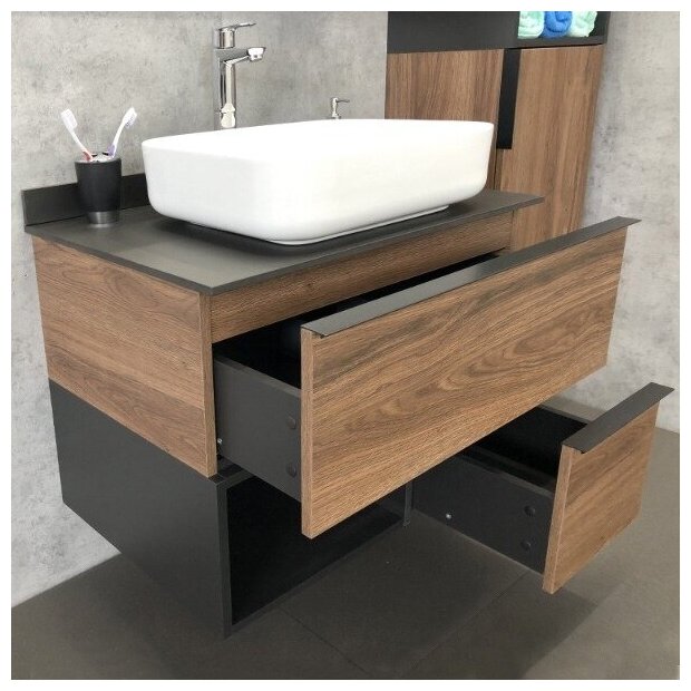 Тумба-умывальник "Штутгарт-75" дуб тёмно-коричневый с черной. столешницей c рак. COMFORTY T-Y9378