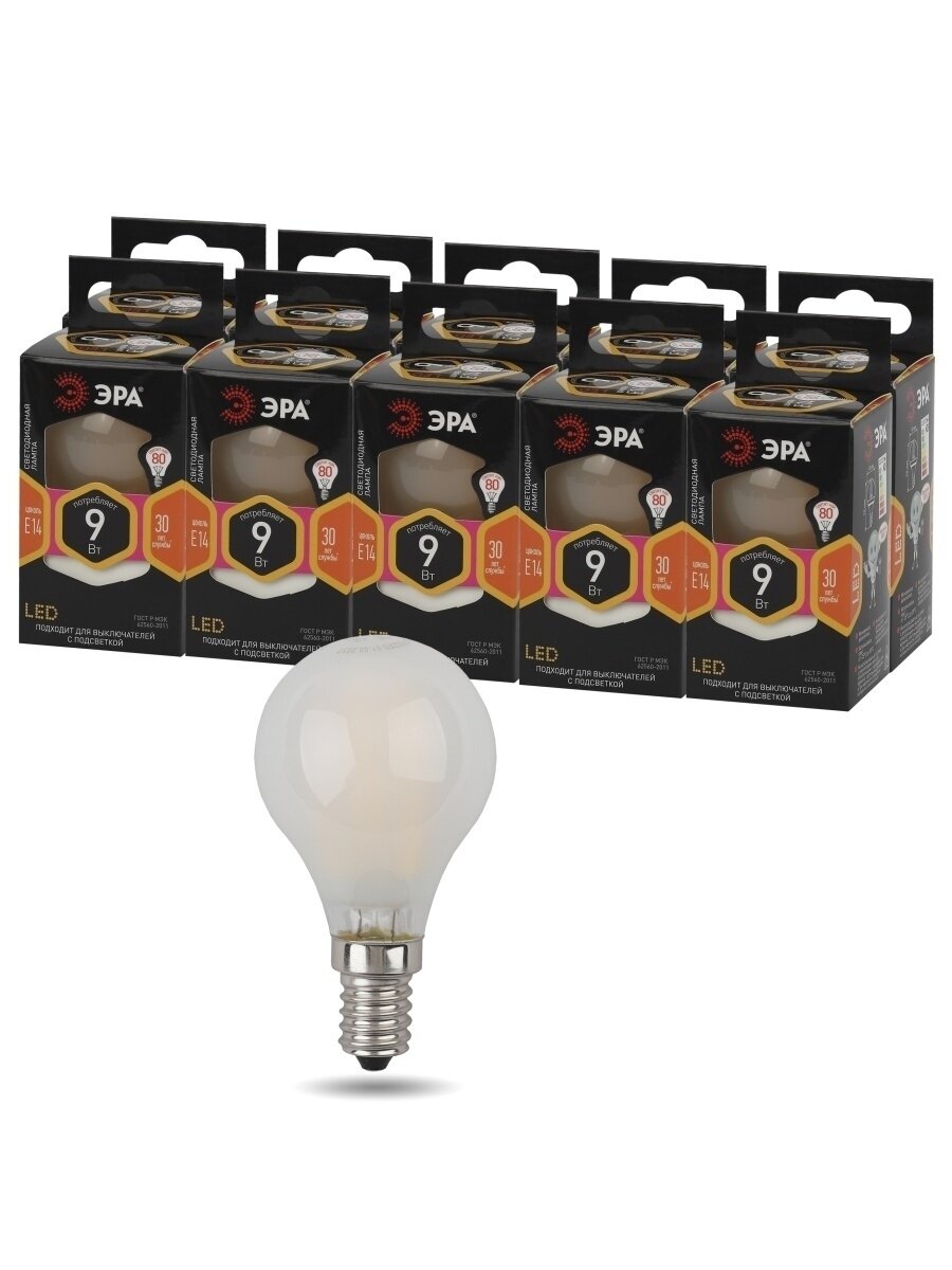 Купить ЭРА F-LED P45-9w-827-E14 frost ЭРА (филамент, шар мат, 9Вт, тепл, E14) (10/100/3600)